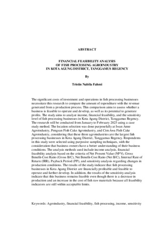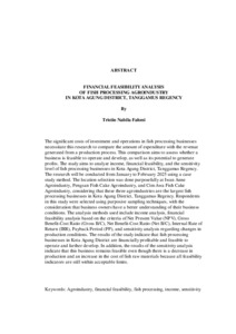 ABSTRACT The significant costs of investment and operations in fish processing businesses necessitate this research to compare the amount of expenditure with the revenue generated from a production process. This comparison aims to assess whether a business is feasible to operate and develop, as well as its potential to generate profits. The study aims to analyze income, financial feasibility, and the sensitivity level of fish processing businesses in Kota Agung District, Tanggamus Regency. The research will be conducted from January to February 2025 using a case study method. The location selection was done purposefully at Iwan Anne Agroindustry, Pengsan Fish Cake Agroindustry, and Cim Awa Fish Cake Agroindustry, considering that these three agroindustries are the largest fish processing businesses in Kota Agung District, Tanggamus Regency. Respondents in this study were selected using purposive sampling techniques, with the consideration that business owners have a better understanding of their business conditions. The analysis methods used include income analysis, financial feasibility analysis based on the criteria of Net Present Value (NPV), Gross Benefit-Cost Ratio (Gross B/C), Net Benefit-Cost Ratio (Net B/C), Internal Rate of Return (IRR), Payback Period (PP), and sensitivity analysis regarding changes in production conditions. The results of the study indicate that fish processing businesses in Kota Agung District are financially profitable and feasible to operate and further develop. In addition, the results of the sensitivity analysis indicate that this business remains feasible even though there is a decrease in production and an increase in the cost of fish raw materials because all feasibility indicators are still within acceptable limits. Keywords: Agroindustry, financial feasibility, fish processing, income, sensitivity ABSTRAK Besarnya biaya investasi dan operasional dalam usaha pengolahan ikan, maka penelitian ini dilakukan untuk mengetahui perbandingan antara jumlah biaya yang dikeluarkan dengan penerimaan dari suatu proses produksi, guna menilai apakah suatu usaha layak untuk dijalankan dan dikembangkan serta mampu memberikan keuntungan. Penelitian ini bertujuan untuk menganalisis pendapatan, kelayakan finansial, dan tingkat sensitivitas usaha pengolahan ikan di Kecamatan Kota Agung, Kabupaten Tanggamus. Penelitian dilaksanakan pada bulan Januari hingga Februari 2025 dengan menggunakan metode studi kasus. Pemilihan lokasi dilakukan secara sengaja (purposive) pada Agroindustri Iwan Anne, Agroindustri Otak-otak Pengsan dan Agroindustri Otak-otak Cim Awa, dengan pertimbangan bahwa ketiga agroindustri ini merupakan agroindustri pengolahan ikan terbesar di Kecamatan Kota Agung, Kabupaten Tanggamus. Responden dalam penelitian ini dipilih menggunakan teknik purposive sampling dengan pertimbangan bahwa pemilik usaha lebih mengetahui keadaan usahanya. Metode analisis yang digunakan meliputi analisis pendapatan, analisis kelayakan finansial berdasarkan kriteria Net Present Value (NPV), Gross Benefit Cost Ratio (Gross B/C), Net Benefit Cost Ratio (Net B/C), Internal Rate of Return (IRR), Payback Period (PP), serta analisis sensitivitas terhadap perubahan kondisi produksi. Hasil penelitian menunjukkan bahwa usaha pengolahan ikan di Kecamatan Kota Agung secara finansial menguntungkan dan layak untuk dijalankan maupun dikembangkan lebih lanjut. Selain itu, hasil analisis sensitivitas mengindikasikan bahwa usaha ini tetap layak meskipun terjadi penurunan produksi dan kenaikan biaya bahan baku ikan karena seluruh indikator kelayakan masih berada dalam batas yang dapat diterima. Kata kunci: Agroindustri, kelayakan finansial, pendapatan, pengolahan ikan, sensitivitas