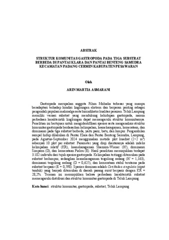 Arin , Martia Asmarani (2025) STRUKTUR KOMUNITAS GASTROPODA PADA TIGA SUBSTRAT BERBEDA DI PANTAI KLARA DAN PANTAI BENTENG SAMUDRA KECAMATAN PADANG CERMIN KABUPATEN PESAWARAN. FAKULTAS MATEMATIKA DAN ILMU PENGETAHUAN ALAM, UNIVERSITAS LAMPUNG.
