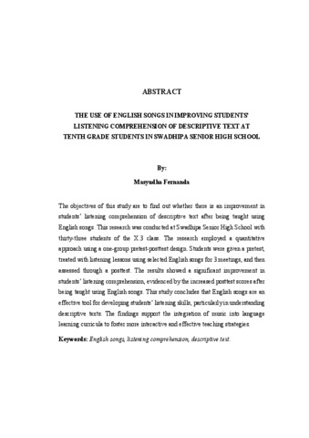 The objectives of this study are to find out whether there is an improvement in students’ listening comprehension of descriptive text after being taught using English songs. This research was conducted at Swadhipa Senior High School with thirty-three students of the X.3 class. The research employed a quantitative approach using a one-group pretest-posttest design. Students were given a pretest, treated with listening lessons using selected English songs for 3 meetings, and then assessed through a posttest. The results showed a significant improvement in students’ listening comprehension, evidenced by the increased posttest scores after being taught using English songs. This study concludes that English songs are an effective tool for developing students’ listening skills, particularly in understanding descriptive texts. The findings support the integration of music into language learning curricula to foster more interactive and effective teaching strategies. Keywords: English songs, listening comprehension, descriptive text.