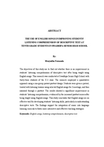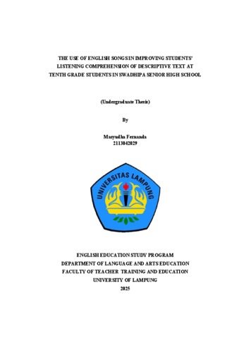Masyudha, Fernanda (2025) THE USE OF ENGLISH SONGS IN IMPROVING STUDENTS' LISTENING COMPREHENSION OF DESCRIPTIVE TEXT AT TENTH GRADE STUDENTS IN SWADHIPA SENIOR HIGH SCHOOL. FAKULTAS KEGURUAN DAN ILMU PENDIDIKAN, UNIVERSITAS LAMPUNG.