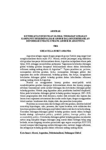 Argentina sebagai negara dengan pengaruh gereja Katolik yang sangat kuat mengkriminalisasi aborsi sejak 1921. Namun, setelah perjuangan yang dilakukan oleh gerakan kampanye dekriminalisasi aborsi, Argentina melegalisasi aborsi pada tahun 2020, sehingga menimbulkan pertanyaan “bagaimana keterkaitan dukungan global terhadap gerakan kampanye dekriminalisasi aborsi dalam keberhasilan reformasi undang-undang aborsi di Argentina?”. Tujuan penelitian ini: pertama, memaparkan aktivitas gerakan, kedua, memaparkan dukungan global, dari organisasi dan media internasional, terhadap gerakan, dan ketiga, menganalisis keterkaitan dukungan global terhadap gerakan dalam keberhasilan reformasi undang-undang aborsi di Argentina. Peneliti ini menggunakan konsep gerakan sosial-politik untuk mendeskripsikan gerakan kampanye dekriminalisasi aborsi dan konsep jaringan advokasi transnasional untuk melihat dukungan dan keterkaitan dukungan global terhadap gerakan. Metode yang digunakan yakni pendekatan kualitatif eksploratif, fokus pada keterkaitan dukungan global terhadap gerakan kampanye 2005-2020, teknik pengumpulan data studi dokumen, sumber data sekunder dari laporan dan laman resmi organisasi internasional dan media-media lepas, dengan menggunakan teknik analisis: kondensasi data, display data, dan penarikan kesimpulan. Penelitian ini menemukan dari berbagai aktivitas gerakan, identitas kolektif mencakup kepentingan, nilai, perasaan, dan tujuan bersama, serta solidaritas dan komitmen gerakan sudah terbangun sejak babak-babak awal dan terus berkembang. Kemudian dukungan-dukungan global terhadap gerakan masuk dalam berbagai bentuk strategi: information politics, symbolic politics, leverage politics, dan accountability politics. Keterkaitan dukungan global terhadap gerakan membentuk sistem yang kompleks dengan dukungan yang masuk dalam berbagai tahap yang berbeda, secara langsung menekan pemerintah agar segera menyetujui RUU IVE (moral) maupun tidak langsung melalui dukungan aksi, material, hingga informasi, dan sebagainya terhadap gerakan dalam reformasi undang-undang aborsi. Kata kunci: Aborsi, Argentina, Dekriminalisasi, Dukungan Global Argentina, a country with strong Catholic church influence, has criminalized abortion since 1921. However, by the efforts of the Abortion Decriminalization Campaign Movement, Argentina legalized abortion in 2020, which raises the question “how is the linkage of global support for the abortion decriminalization campaign movement to the success of abortion law reform in Argentina?”. The objectives of this study are: first, to describe the activities of the movement, second, to describe global support, include international organization and international media, for the movement, and third, to analyze the linkage of global support for the movement in the successful reform of the abortion law in Argentina. The researcher used the concept of social-political movement to describe the abortion decriminalization campaign movement and the concept of transnational advocacy networks to see the support and the linkage of global support for the movement. The method used is an exploratory qualitative approach, focusing on the linkage of global support for the 2005-2020 campaign movement, document study data collection techniques, secondary data sources from the official reports and websites of international organizations and media, using analysis techniques: data condensation, data display, and conclusion drawing. This study finds from the activities of the movement, that the collective identity encompasses shared interests, values, emotions, and goals, along with a sense of solidarity and commitment has been established since the early stages and continues to grow. Then all the global supports for the movement manifests through various strategic forms: information politics, symbolic politics, leverage politics, and accountability politics. The linkage of the global supports for the campaign movement creates a complex system in which global support operates at different stages, exerting both direct (moral) pressure on the government to approve the IVE Bill and indirect support through actions, material aid, information, and other means in the effort to reform abortion laws. Keywords: Abortion, Argentina, Decriminalization, Global Support