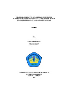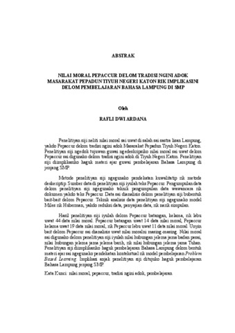 Penelitiyan siji neliti nilai moral sai uwat di salah sai sastra lisan Lampung, yakdo Pepaccur delom tradisi ngini adok Masarakat Pepadun Tiyuh Negeri Katon. Penelitiyan siji ngedok tujuwan guwai ngedeskripsiko nilai moral sai uwat delom Pepaccur sai digunako delom tradisi ngini adok di Tiyuh Negeri Katon. Penelitiyan siji diimplikasiko haguk materi ajar guwai pembelajaran Bahasa Lampung di jenjang SMP. Metode penelitiyan siji ngegunako pendekatan kuwalitatip rik metode deskeriptip. Sumber data di penelitiyan siji iyulah teks Pepaccur. Pengumpulan data delom penelitiyan siji ngegunako teknik pengumpulan data wawancara rik dokumen yakdo teks Pepaccur. Data sai dianalisis delom penelitiyan siji bubentuk bait-bait delom Pepaccur. Teknik analisis data penelitiyan siji ngegunako model Miles rik Huberman, yakdo reduksi data, penyajian data, rik narik simpulan. Hasil penelitiyan siji iyulah delom Pepaccur batangan, kelama, rik lebu uwat 44 data nilai moral. Pepaccur batangan uwat 14 data nilai moral, Pepaccur kelama uwat 19 data nilai moral, rik Pepaccur lebu uwat 11 data nilai moral. Unyin bait delom Pepaccur sai dianalisis uwat nilai moralni masing-masing. Nilai moral sai digunako delom penelitiyan siji iyulah nilai hubungan jelema jama badan pesai, nilai hubungan jelema jama jelema barih, rik nilai hubungan jelema jama Tuhan. Penelitian ini meneliti nilai moral yang ada di salah satu sastra lisan Lampung, yaitu Pepaccur dalam tradisi ngini adok Masyarakat Pepadun Desa Negeri Katon. Penelitian ini memiliki tujuan untuk mendeskripsikan nilai moral yang terdapat dalam Pepaccur yang digunakan dalam tradisi ngini adok di Desa Negeri Katon. Penelitian ini diimplikasikan ke materi ajar untuk pembelajaran Bahasa Lampung di jenjang SMP. Metode penelitian ini menggunakan pendekatan kualitatif dan metode deksriptif. Sumber data di penelitian ini adalah teks Pepaccur. Pengumpulan data dalam penelitian ini menggunakan teknik pengumpulan data wawancara dan dokumen berupa teks Pepaccur. Data yang dianalisis dalam penelitian ini berbentuk bait-bait dalam Pepaccur. Teknik analisis data penelitian ini menggunakan model Miles dan Huberman, yaitu reduksi data, penyajian data, dan menarik simpulan. Hasil penelitian ini adalah dalam Pepaccur batangan, kelama, dan lebu terdapat 44 data nilai moral. Pepaccur batangan memiliki 14 data nilai moral, Pepaccur kelama memiliki 19 data nilai moral, dan Pepaccur lebu memiliki 11 data nilai moral. Seluruh bait dalam Pepaccur yang dianalisis memiliki nilai moralnya masing-masing. Nilai moral yang digunakan dalam penelitian ini adalah nilai hubungan manusia dengan diri sendiri, nilai hubungan manusia dengan orang lain dalam lingkup sosial, dan nilai hubungan manusia dengan Tuhan. Penelitian ini diimplikasikan ke pembelajaran Bahasa Lampung dalam bentuk materi ajar yang menggunakan pendekatan kontekstual dan model pembelajaran Problem Based Learning. Implikasi dari penelitian ini ditujukan ke pembelajaran Bahasa Lampung di jenjang SMP. Kata Kunci: nilai moral, pepaccur, tradisi ngini adok, pembelajaran Penelitiyan siji diimplikasiko haguk pembelajaran Bahasa Lampung delom bentuk materi ajar sai ngegunako pendekatan kontekstual rik model pembelajaran Problem Based Learning. Implikasi anjak penelitiyan siji ditujuko haguk pembelajaran Bahasa Lampung jenjang SMP. Kata Kunci: nilai moral, pepaccur, tradisi ngini adok, pembelajaran