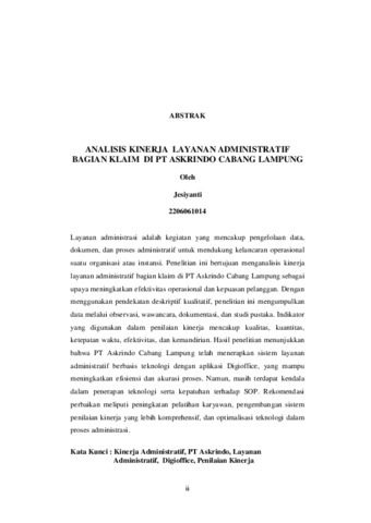 Layanan administrasi adalah kegiatan yang mencakup pengelolaan data, dokumen, dan proses administratif untuk mendukung kelancaran operasional suatu organisasi atau instansi. Penelitian ini bertujuan menganalisis kinerja layanan administratif bagian klaim di PT Askrindo Cabang Lampung sebagai upaya meningkatkan efektivitas operasional dan kepuasan pelanggan. Dengan menggunakan pendekatan deskriptif kualitatif, penelitian ini mengumpulkan data melalui observasi, wawancara, dokumentasi, dan studi pustaka. Indikator yang digunakan dalam penilaian kinerja mencakup kualitas, kuantitas, ketepatan waktu, efektivitas, dan kemandirian. Hasil penelitian menunjukkan bahwa PT Askrindo Cabang Lampung telah menerapkan sistem layanan administratif berbasis teknologi dengan aplikasi Digioffice, yang mampu meningkatkan efisiensi dan akurasi proses. Namun, masih terdapat kendala dalam penerapan teknologi serta kepatuhan terhadap SOP. Rekomendasi perbaikan meliputi peningkatan pelatihan karyawan, pengembangan sistem penilaian kinerja yang lebih komprehensif, dan optimalisasi teknologi dalam proses administrasi. Kata Kunci : Kinerja Administratif, PT Askrindo, Layanan Administratif, Digioffice, Penilaian Kinerja Administrative services are activities that include managing data, documents and administrative processes to support the smooth operations of an organization or agency. This research aims to analyze the performance of administrative services in the claims section at PT Askrindo Lampung Branch as an effort to increase operational effectiveness and customer satisfaction. Using a qualitative descriptive approach, this research collected data through observation, interviews, documentation and literature study. Indicators used in performance assessment include quality, quantity, timeliness, effectiveness and independence. The research results show that PT Askrindo Lampung Branch has implemented a technology-based administrative service system with the Digioffice application, which is able to increase process efficiency and accuracy. However, there are still obstacles in implementing technology and complying with SOPs. Recommendations for improvement include increasing employee training, developing a more comprehensive performance appraisal system, and optimizing technology in administrative processes. Keywords: Administrative Performance, PT Askrindo, Administrative Services, Digioffice, Performance Assessment