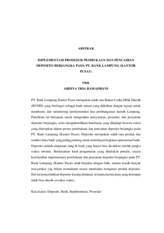 ABSTRAK PT. Bank Lampung Kantor Pusat merupakan salah satu Badan Usaha Milik Daerah (BUMD) yang berfungsi sebagai bank umum yang didirikan dengan tujuan untuk membantu dan mendorong perekonomian dan pembangunan daerah Lampung. Penelitian ini bertujuan untuk mengetahui persyaratan, prosedur, dan pencairan deposito berjangka, serta mengidentifikasi hambatan yang dihadapi beserta solusi yang diterapkan dalam proses pembukaan dan pencairan deposito berjangka pada PT. Bank Lampung (Kantor Pusat). Deposito merupakan salah satu produk dan sumber dana bank yang paling penting untuk membiayai kegiatan operasional bank. Deposito adalah simpanan uang di bank yang hanya bisa dicairkan setelah jangka waktu tertentu. Berdasarkan hasil pengamatan yang dilakukan penulis, secara keseluruhan implementasi pembukaan dan pencairan deposito berjangka pada PT. Bank Lampung (Kantor Pusat) telah berjalan dengan baik, namun masih banyak masyarakat yag belum memahami secara mendalam mengenai produk deposito. Hal ini menyebabkan deposito kurang diminati, terutama karna dana yang disimpan tidak bisa ditarik sewaktu waktu. Kata kunci: Deposito, Bank, Implementasi, Prosedur ABSTRACT PT. Bank Lampung Head Office is one of the Regional-Owned Enterprises (BUMD) that operates as a commercial bank with the aim of supporting and promoting the economic development of the Lampung region. This research aims to examine the requirements, procedures, and processes involved in the opening and withdrawal of term deposits, as well as to identify the challenges encountered and the solutions implemented at PT. Bank Lampung (Head Office). Term deposits are one of the bank’s key products and funding sources used to support its operational activities. A term deposit refers to a bank deposit that can only be withdrawn after a predetermined period. Based on the author’s observations, the overall implementation of the term deposit opening and withdrawal procedures at PT. Bank Lampung (Head Office) has been running effectively. However, public understanding of term deposit products remains limited. This lack of awareness leads to lower public interest in term deposits, mainly due to the inability to access the funds at any time. Keywords: Term Deposit, Bank, Implementation, Procedure