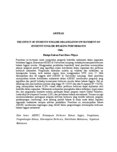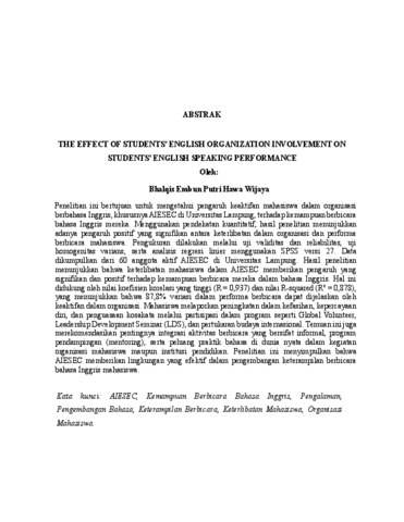 ABSTRAK Penelitian ini bertujuan untuk mengetahui pengaruh keaktifan mahasiswa dalam organisasi berbahasa Inggris, khususnya AIESEC di Universitas Lampung, terhadap kemampuan berbicara bahasa Inggris mereka. Menggunakan pendekatan kuantitatif, hasil penelitian menunjukkan adanya pengaruh positif yang signifikan antara keterlibatan dalam organisasi dan performa berbicara mahasiswa. Pengukuran dilakukan melalui uji validitas dan reliabilitas, uji homogenitas varians, serta analisis regresi linier menggunakan SPSS versi 27. Data dikumpulkan dari 60 anggota aktif AIESEC di Universitas Lampung. Hasil penelitian menunjukkan bahwa keterlibatan mahasiswa dalam AIESEC memberikan pengaruh yang signifikan dan positif terhadap kemampuan berbicara mereka dalam bahasa Inggris. Hal ini didukung oleh nilai koefisien korelasi yang tinggi (R = 0,937) dan nilai R-squared (R2 = 0,878), yang menunjukkan bahwa 87,8% variasi dalam performa berbicara dapat dijelaskan oleh keaktifan dalam organisasi. Mahasiswa melaporkan peningkatan dalam kefasihan, kepercayaan diri, dan penguasaan kosakata melalui partisipasi dalam program seperti Global Volunteer, Leadership Development Seminar (LDS), dan pertukaran budaya internasional. Temuan ini juga merekomendasikan pentingnya integrasi aktivitas berbicara yang bersifat informal, program pendampingan (mentoring), serta peluang praktik bahasa di dunia nyata dalam kegiatan organisasi mahasiswa maupun institusi pendidikan. Penelitian ini menyimpulkan bahwa AIESEC memberikan lingkungan yang efektif dalam pengembangan keterampilan berbicara bahasa Inggris mahasiswa. Kata kunci: AIESEC, Kemampuan Berbicara Bahasa Inggris, Pengalaman, Pengembangan Bahasa, Keterampilan Berbicara, Keterlibatan Mahasiswa, Organisasi Mahasiswa. ABSTRACT This study investigates the effect of students’ involvement in English organizations, specifically AIESEC at Universitas Lampung, on their English-speaking performance. Using a quantitative research design, the findings reveal a significant positive effect between organizational involvement and speaking performance, as measured by validity and reliability tests, homogeneity of variance tests, and linear regression analysis using SPSS 27. The study analyzes data collected from 60 active AIESEC members at the University of Lampung. The findings reveal that students’ involvement in AIESEC has a significant and positive effect on their speaking performance. This is supported by a high correlation coefficient (R = 0.937) and R- squared value (R2 = 0.878), indicating that 87.8% of the variation in speaking performance is explained by organizational involvement. Students reported improvements in fluency, confidence, and vocabulary through participation in activities such as Global Volunteer programs, Leadership Development Seminars (LDS), and cross-cultural exchanges. The findings reveal that students’involvement in AIESEC has a significant and positive effect on their speaking performance. Students reported experiencing increased fluency, confidence, and articulation, with recommendations for incorporating more informal speaking activities, mentorship programs, and additional opportunities for real-world language practice. The study concludes that AIESEC provides an effective environment for developing English- speaking skills and recommends integrating more immersive, practice-oriented activities into both student organizations and universities. Keywords: AIESEC, English-speaking Performance, Experience, Language Development, Speaking Skills, Student Engagement, Student Organization.