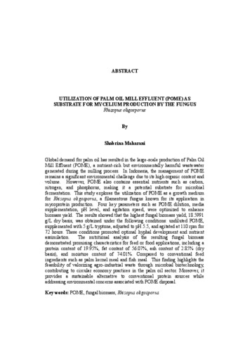 ABSTRACT Global demand for palm oil has resulted in the large-scale production of Palm Oil Mill Effluent (POME), a nutrient-rich but environmentally harmful wastewater generated during the milling process. In Indonesia, the management of POME remains a significant environmental challenge due to its high organic content and volume. However, POME also contains essential nutrients such as carbon, nitrogen, and phosphorus, making it a potential substrate for microbial fermentation. This study explores the utilization of POME as a growth medium for Rhizopus oligosporus, a filamentous fungus known for its application in mycoprotein production. Four key parameters such as POME dilution, media supplementation, pH level, and agitation speed, were optimized to enhance biomass yield. The results showed that the highest fungal biomass yield, 18.5991 g/L dry basis, was obtained under the following conditions: undiluted POME, supplemented with 5 g/L tryptone, adjusted to pH 5.5, and agitated at 110 rpm for 72 hours. These conditions promoted optimal hyphal development and nutrient assimilation. The nutritional analysis of the resulting fungal biomass demonstrated promising characteristics for feed or food applications, including a protein content of 19.95%, fat content of 56.07%, ash content of 2.85% (dry basis), and moisture content of 74.01%. Compared to conventional feed ingredients such as palm kernel meal and fish meal. This finding highlights the feasibility of valorizing agro-industrial waste through microbial biotechnology, contributing to circular economy practices in the palm oil sector. Moreover, it provides a sustainable alternative to conventional protein sources while addressing environmental concerns associated with POME disposal. Key words: POME, fungal biomass, Rhizopus oligosporus ABSTRAK Permintaan global terhadap minyak sawit telah menyebabkan produksi limbah cair pabrik kelapa sawit (LCPKS) dalam skala besar, yaitu limbah cair yang kaya nutrisi namun berpotensi mencemari lingkungan dan dihasilkan selama proses pengolahan minyak sawit. Di Indonesia, pengelolaan LCPKS masih menjadi tantangan lingkungan yang signifikan karena tingginya kandungan bahan organik dan volumenya yang besar. Namun, LCPKS juga mengandung nutrisi penting seperti karbon, nitrogen, dan fosfor, sehingga memiliki potensi sebagai substrat fermentasi mikroba. Penelitian ini mengeksplorasi pemanfaatan LCPKS sebagai media pertumbuhan untuk Rhizopus oligosporus, yaitu jamur berfilamen yang dikenal dalam produksi mikoprotein. Empat parameter utama seperti pengenceran LCPKS, suplementasi media, tingkat pH, dan kecepatan agitasi dioptimalkan untuk meningkatkan hasil biomassa. Hasil menunjukkan bahwa hasil biomassa jamur tertinggi sebesar 18,5991 g/L berat kering diperoleh pada kondisi berikut: POME tanpa pengenceran, disuplai dengan 5 g/L tripton, disesuaikan pada pH 5,5, dan diaduk dengan kecepatan 110 rpm selama 72 jam. Kondisi ini mendukung perkembangan hifa yang optimal dan penyerapan nutrisi secara efisien. Analisis nutrisi dari biomassa jamur yang dihasilkan menunjukkan karakteristik yang menjanjikan untuk aplikasi sebagai pakan atau pangan, dengan kandungan protein sebesar 19,95%; lemak 56,07%; abu 2,85% (berat kering); kadar air 74,01%. Hasil ini menunjukkan potensi pemanfaatan limbah agroindustri melalui bioteknologi mikroba yang mendukung praktik ekonomi sirkular di sektor kelapa sawit. Selain itu, hal ini memberikan alternatif berkelanjutan terhadap sumber protein konvensional sekaligus mengatasi permasalahan lingkungan akibat pembuangan POME. Kata kunci: LCPKS, biomassa jamur, Rhizopus oligosporus