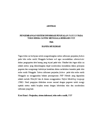 Tugas Akhir ini bertujuan untuk mengembangkan sistem informasi penjualan fashion pada toko serba cantik Menggala berbasis web agar memudahkan administrator dalam penginputan data barang yang terjual pada toko. Manfaat dari tugas akhir ini adalah sistem yang dikembangkan dapat memberikan kemudahan dalam pekerjaan pegawai dan mengurangi timbulnya kesalahan dalam melakukan transaksi pada toko serba cantik Menggala. Sistem informasi penjualan fashion pada toko serba cantik Menggala ini menggunakan bahasa pemrograman PHP. Metode yang digunakan adalah metode Waterfall dan di desain menggunakan Unified Modelling Language (UML). Hasil pengujian dilakukan secara manual dengan pegawai untuk mengji apakah sistem sudah berjalan sesuai dengan kebutuhan toko dan memberikan informasi yang baik. Kata Kunci : Penjualan, sistem informasi, toko serba cantik, PHP This final project aims to develop a web-based fashion sales information system at the Menggala beauty shop to make it easier for administrators to input data on goods sold at the shop. The benefit of this final project is that the system developed can provide convenience in employee work and reduce errors in making transactions at the Menggala beauty shop. The fashion sales information system at the Menggala beauty shop uses the PHP programming language. The method used is the Waterfall method and is designed using the Unified Modeling Language (UML). The test results are carried out manually with employees to test whether the system is running according to the shop's needs and provides good information. Keywords: Sales, information system, beauty shop, PHP