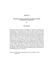 ABSTRACT HOUSEHOLD LABOR ALLOCATION OF COFFEE FARMERS IN BALIK BUKIT SUB-DISTRICT By Rini Aprilyani This research aims to analyze the distribution of on-farm and off-farm labor contributions per month over one year, determine if farmers are fully employed, underemployed, or unemployed, and analyze the labor productivity of coffee farming households. The study employed a survey method, with data analyzed using labor contribution analysis and labor productivity analysis. The results indicate that the average total annual labor contribution of male farmers in Balik Bukit Sub- district is 1,340 hours, or 112 hours per month. For female farmers, the average total annual labor contribution is 1,153 hours. Coffee farmers in Balik Bukit Sub- district are not yet fully employed. This is because the average monthly labor contribution for male farmers is only 112 hours, falling short of the 140 hours per month considered full employment. The average total household labor productivity of coffee farmers in Balik Bukit Sub-district is Rp 245,994.76 per daily equivalent work unit (HOK). According to the Badan Pusat Statistik (BPS) of Lampung Province, the minimum monthly wage for Lampung Barat Regency is Rp 2,893,069.00, which translates to Rp 137,765.19 for one active workday. Based on these findings, it can be concluded that the household productivity of coffee farmers in Balik Bukit Sub-district is productive. Keywords: Coffee farmers, Household labor, Labor contribution, Labor productivity ABSTRAK Penelitian ini bertujuan untuk Menganalisis sebaran curahan tenaga kerja pada usahatani dan non usahatani per bulan dalam satu tahun, Mengetahui Petani bekerja secara penuh, setengah menganggur atau menganggur, dan Menganalisis produktivitas tenaga kerja rumah tangga Petani kopi. Metode penelitian ini menggunakan metode survey. Analisis data yang digunakan adalah analisis curahan tenaga kerja dan analisis produktivitas tenaga kerja. Hasil analisis menunjukkan bahwa Total rata-rata curahan jam kerja petani pria di Kecamatan Balik Bukit sebesar 1.340 jam/tahun atau 112 jam/bulan. Total rata-rata jam kerja wanita di kecamatan Balik Bukit sebesar 1.153 jam/tahun atau jam/bulan. Petani kopi di Kecamatan Balik Bukit belum bekerja secara penuh karena total rata-rata curahan jam kerja petani petani pria di Kecamataan Balik bukit hanya sebesar 112 jam/bulan dan belum mencapai 140 jam/bulan. Total rata rata produktivitas tenaga kerja rumah tangga petani kopi di Kecamatan Balik Bukit adalah sebesar Rp 245.994,76/HOK. Menurut BPS Provinsi Lampung, upah minimum selama satu bulan Provinsi Lampung Kabupaten Lampung Barat sebesar Rp 2.893.069,00 atau sebesar Rp 137.765,19 selama 1 hari jam kerja aktif. Dapat disimpulkan bahwa kategori produktivitas rumah tangga petani kopi di Kecamatan Balik Bukit adalah produktif. Kata Kunci: Petani kopi, Tenaga kerja rumah tangga, Curahan tenaga kerja, Produktivitas tenaga kerja