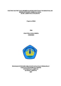 Chantika , Faras Dhifa (2025) FAKTOR-FAKTOR YANG MEMPENGARUHI KEPUTUSAN NASABAH DALAM MEMILIH PRODUK SIMPANAN PADA BANK LAMPUNG KCP KARTINI. [Diploma/Tugas Akhir]