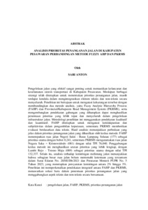 Pengelolaan jalan yang efektif sangat penting untuk memastikan kelancaran dan keselamatan sistem transportasi di Kabupaten Pesawaran. Meskipun berbagai strategi telah diterapkan untuk menentukan prioritas penanganan jalan, masih terdapat kendala dalam mengintegrasikan elemen teknis dan non-teknis secara menyeluruh. Penelitian ini bertujuan untuk mengatasi kekurangan tersebut dengan membandingkan dua metode analisis, yaitu Fuzzy Analytic Hierarchy Process (FAHP) dan Provincial/Kabupaten Road Management System (PKRMS), serta mengembangkan pendekatan gabungan yang diharapkan dapat menghasilkan penentuan prioritas yang lebih tepat dan menyeluruh dalam pengelolaan infrastruktur jalan. Metodologi penelitian ini menggunakan pendekatan kualitatif dan kuantitatif. FAHP diterapkan untuk mengatasi ketidakpastian dan subjektivitas dalam pengambilan keputusan, sementara PKRMS memberikan evaluasi berdasarkan data teknis. Hasil analisis menunjukkan perbedaan yang jelas dalam prioritas penanganan jalan yang dihasilkan oleh kedua metode. FAHP menempatkan ruas jalan Negeri Sakti - Batas Lampung Selatan (177) sebagai prioritas utama dengan bobot 0,241, sementara PKRMS mengutamakan ruas jalan Negara Saka – Krisnowidodo (081) dengan nilai TPI 76,040. Penggabungan kedua metode ini menghasilkan urutan prioritas yang lebih lengkap, dengan Lumbi Rejo - Tresno Maju (089) sebagai prioritas utama dengan nilai TPI 132,337. Selain itu, analisis terhadap kemiringan melintang jalan menunjukkan bahwa sebagian besar ruas jalan belum memenuhi ketentuan yang tercantum dalam Surat Edaran No. 20/SE/Db/2021 dan Peraturan Menteri PUPR No. 5 Tahun 2023, yang menetapkan persyaratan kemiringan antara 2% hingga 3%. Penelitian ini memperkenalkan pendekatan integratif antara FAHP dan PKRMS, menawarkan solusi baru dalam penentuan prioritas penanganan jalan yang menggabungkan aspek teknis dan non-teknis secara bersamaan. Kata Kunci : pengelolaan jalan, FAHP, PKRMS, prioritas penanganan jalan Effective road management is crucial to ensure the smooth flow and safety of the transportation system in Pesawaran Regency. Although various strategies have been implemented to determine road treatment priorities, challenges remain in fully integrating both technical and non-technical elements. This study aims to address these shortcomings by comparing two analytical methods: the Fuzzy Analytic Hierarchy Process (FAHP) and the Provincial/District Road Management System (PKRMS), and developing a combined approach that is expected to provide more accurate and comprehensive prioritization in road infrastructure management. The research methodology employs both qualitative and quantitative approaches. FAHP is applied to address uncertainty and subjectivity in decision-making, while PKRMS provides evaluations based on technical data. The analysis results show clear differences in the road treatment priorities produced by both methods. FAHP ranks the road segment Negeri Sakti - Batas Lampung Selatan (177) as the top priority with a weight of 0.241, while PKRMS prioritizes the road segment Negara Saka – Krisnowidodo (081) with a TPI value of 76.040. The integration of both methods results in a more comprehensive priority sequence, with Lumbi Rejo - Tresno Maju (089) ranked as the top priority with a TPI value of 132.337. Additionally, the analysis of the cross-sectional slope of the roads indicates that most road segments do not meet the requirements specified in Circular Letter No. 20/SE/Db/2021 and the Minister of Public Works and Housing Regulation No. 5 of 2023, which set the slope standards between 2% and 3%. This study introduces an integrative approach between FAHP and PKRMS, offering a new solution for determining road treatment priorities that simultaneously incorporates both technical and