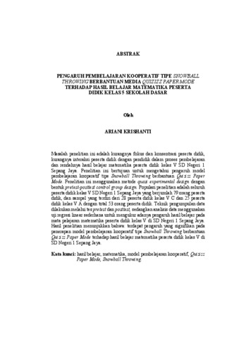 ABSTRAK Masalah penelitian ini adalah kurangnya fokus dan konsentrasi peserta didik, kurangnya interaksi peserta didik dengan pendidik dalam proses pembelajaran dan rendahnya hasil belajar matematika peserta didik kelas V SD Negeri 1 Sepang Jaya. Penelitian ini bertujuan untuk mengetahui pengaruh model pembelajaran kooperatif tipe Snowball Throwing berbantuan Quizizz Paper Mode. Penelitian ini menggunakan metode quasi experimental design dengan bentuk pretest-posttest control group design. Populasi penelitian adalah seluruh peserta didik kelas V SD Negeri 1 Sepang Jaya yang berjumlah 79 orang peserta didik, dan sampel yang terdiri dari 28 peserta didik kelas V C dan 25 peserta didik kelas V A dengan total 53 orang peserta didik. Teknik pengumpulan data dilakukan melalui tes pretest dan posttest, sedangkan analisis data menggunakan uji regresi linear sederhana untuk mengukur adanya pengaruh hasil belajar pada mata pelajaran matematika peserta didik kelas V di SD Negeri 1 Sepang Jaya. Hasil penelitian menunjukkan bahwa: terdapat pengaruh yang signifikan pada penerapan model pembelajaran kooperatif tipe Snowball Throwing berbantuan Quizizz Paper Mode terhadap hasil belajar matematika peserta didik kelas V di SD Negeri 1 Sepang Jaya. Kata kunci: hasil belajar, matematika, model pembelajaran kooperatif, Quizizz Paper Mode, Snowball Throwing. ABSTRACT The problem of this research was the lack of focus and concentration of students, the lack of interaction between students and educators in the learning process and the low mathematics learning outcomes of class V students of SD Negeri 1 Sepang Jaya. This study aimed to determined the effect of the Snowball Throwing cooperative learning model assisted by Quizizz Paper Mode. This study used a quasi-experimental design method with a pretest-posttest control group design. The population of the study was all class V students of SD Negeri 1 Sepang Jaya totaling 79 students, and a sample consisting of 28 class V C students and 25 class V A students with a total of 53 students. Data collection techniques were carried out through pretest and posttest tests, while data analysis used a simple linear regression test to measure the effect of learning outcomes on mathematics subjects of class V students at SD Negeri 1 Sepang Jaya. The results of the study showed that: there is a significant influence on the application of the Snowball Throwing cooperative learning model assisted by Quizizz Paper Mode on the mathematics learning outcomes of class V students at SD Negeri 1 Sepang Jaya. Keywords: cooperative learning model, learning outcomes, mathematics, Quizizz Paper Mode, Snowball Throwing.