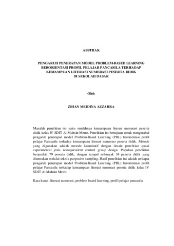 ABSTRAK Masalah penelitian ini yaitu rendahnya kemampuan literasi numerasi peserta didik kelas IV SDIT Al Muhsin Metro. Penelitian ini bertujuan untuk mengetahui pengaruh penerapan model Problem-Based Learning (PBL) berorientasi profil pelajar Pancasila terhadap kemampuan literasi numerasi peserta didik. Metode yang digunakan adalah metode kuantitatif dengan desain penelitian quasi experimental jenis nonequivalent control group design. Populasi penelitian berjumlah 79 peserta didik, dengan sampel sebanyak 34 peserta didik yang ditentukan melalui teknik purposive sampling. Hasil penelitian ini adalah terdapat pengaruh penerapan model Problem-Based Learning (PBL) berorientasi profil pelajar Pancasila terhadap kemampuan literasi numerasi peserta didik kelas IV SDIT Al Muhsin Metro. Kata kunci: literasi numerasi, problem based learning, profil pelajar pancasila ABSTRACT The issue addressed in this study was the low numeracy literacy skills of fourth- grade students at SDIT Al Muhsin Metro. This research aimed to examine the effect of implementing the Problem-Based Learning (PBL) model oriented toward the Pancasila Student Profile on students' numeracy literacy skills. The study employed a quantitative method with a quasi-experimental design using a nonequivalent control group design. The population consisted of 79 students, with a sample of 34 students selected through purposive sampling. The results of this research were that the implementation of the Problem-Based Learning (PBL) model oriented toward the Pancasila student profile significantly affected the numeracy literacy skills of fourth-grade students at SDIT Al Muhsin Metro. Keywords: numeracy literacy, pancasila student profile, problem-based learning