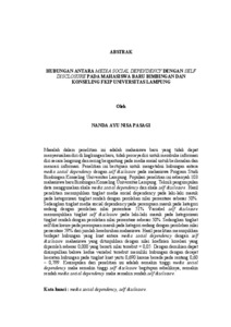 ABSTRAK Masalah dalam penelitian ini adalah mahasiswa baru yang tidak dapat menyesuaikan diri di lingkungan baru, tidak percaya diri untuk membuka informasi diri secara langsung dan sering bergantung pada media sosial untuk berkenalan dan mencari informasi. Penelitian ini bertujuan untuk mengetahui hubungan antara media social dependency dengan self disclosure pada mahasiswa Program Studi Bimbingan Konseling Universitas Lampung. Populasi penelitian ini sebanyak 103 mahasiswa baru Bimbingan Konseling Universitas Lampung. Teknik pengumpulan data menggunakan skala media social dependency dan skala self disclosure. Hasil penelitian menunjukkan tingkat media social dependency pada laki-laki masuk pada kategorisasi tingkat rendah dengan perolehan nilai persentase sebesar 50%. Sedangkan tingkat media social dependency pada perempuan masuk pada kategori sedang dengan perolehan nilai persentase 51%. Variabel self disclosure menunujukkan tingkat self disclosure pada laki-laki masuk pada kategorisasi tingkat rendah dengan perolehan nilai persentase sebesar 50%. Sedangkan tingkat self disclosure pada perempuan masuk pada kategori sedang dengan perolehan nilai persentase 59% dari jumlah keseluruhan mahasiswa. Hasil penelitian menunjukkan terdapat hubungan yang kuat antara media social dependency dengan self disclosure mahasiswa yang ditunjukkan dengan nilai koefisien korelasi yang diperoleh sebesar 0,000 yang berarti nilai tersebut < 0,05. Dengan demikian dapat disimpulkan bahwa kedua variabel tersebut memiliki hubungan dengan derajat keeratan hubungan pada tingkat kuat yaitu 0,690 karena berada pada rentang 0,60 – 0,799. Kesimpulan dari penelitian ini adalah semakin tinggi media social dependency maka semakin tinggi self disclosure begitupun sebaliknya, semakin rendah media social dependency maka semakin rendah self disclosure. Kata kunci : media social dependency, self disclosure. ABSTRACT The problem in this study is new students who cannot adjust in a new environment, not confident to disclose personal information directly and often depend on social media to get acquainted and find information. This study aims to determine the relationship between social media dependency and self-disclosure in students of the University of Lampung Guidance Counseling Study Program. The population of this study were 103 new students of University of Lampung Counseling Guidance. Data collection techniques using social media dependency scale and self-disclosure scale. The results showed that the level of social media dependency in men was included in the low level categorization with a percentage value of 50%. While the level of social media dependency in women is in the medium category with a percentage value of 51%. Meanwhile, the self-disclosure variable shows that the level of self-disclosure in men is categorized at a low level with a percentage value of 50%. Meanwhile, the level of self-disclosure in women is in the moderate category with a percentage value of 59% of the total number of students. The results showed that there is a strong relationship between social media dependency and student self-disclosure. Keywords: media social dependency, self disclosure.
