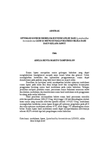 Adelia , Renta Marito Tampubolon (2025) OPTIMASI KONDISI IMOBILISASI ENZIM LIPASE DARI Lysinibacillus boronitolerans LKM G1 MENGGUNAKAN MATRIKS SILIKA DARI DAUN KELAPA SAWIT. FAKULTAS MATEMATIKA DAN ILMU PENGETAHUAN ALAM, UNIVERSITAS LAMPUNG.