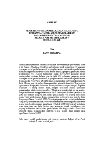 Masalah dalam penelitian ini adalah rendahnya motivasi belajar peserta didik kelas V SD Negeri 1 Candimas. Penelitian ini bertujuan untuk mengetahui (1) pengaruh penerapan model pembelajaran role playing berbantuan media video pembelajaran dalam meningkatkan motivasi belajar peserta didik (2) pengaruh penerapan model pembelajaran role playing berbantuan media PowerPoint interaktif dalam meningkatkan motivasi belajar peserta didik (3) perbedaan pengaruh antara penerapan model pembelajaran role playing berbantuan media video pembelajaran dengan media PowerPoint interaktif dalam meningkatkan motivasi belajar peserta didik. Metode yang digunakan dalam penelitian ini adalah kuantitatif dengan jenis experimental design yaitu desain dua kelompok (between subject design). Populasi berjumlah 57 orang peserta didik, dengan penentuan sampel penelitian menggunakan teknik random sampling. Teknik pengumpulan data berupa angket. Pengujian hipotesis menggunakan rumus uji-T. Kesimpulan dari hasil penelitian ini yaitu: (1) terdapat pengaruh dari model pembelajaran role playing berbantuan media video pembelajaran dalam meningkatkan motivasi belajar peserta didik dengan signifikansi (2-tailed) 0.000 (2) terdapat pengaruh dari model pembelajaran role playing berbantuan media PowerPoint interaktif dalam meningkatkan motivasi belajar peserta didik dengan signifikansi (2-tailed) 0.000 (3) terdapat perbedaan kelas eksperimen dan kelas kontrol dari penerapan model pembelajaran role playing berbantuan media video pembelajaran dan dengan media PowerPoint interaktif dalam meningkatkan motivasi belajar peserta didik dengan nilai signifikansi (2-tailed) 0.000. Kata kunci: model pembelajaran role playing, motivasi belajar, PowerPoint interaktif, video pembelajaran. The problem in this study was the low learning motivation of fifth grade students at SD Negeri 1 Candimas. This study aimed to determine (1) the effect of applying the role playing learning model assisted by instructional video media in increasing students learning motivation, (2) the effect of applying the role playing learning model assisted by interactive PowerPoint media in increasing students’ learning motivation, and (3) the difference in effect between the application of the role playing learning model assisted by instructional video media and that assisted by interactive PowerPoint media in increasing students’ learning motivation. The method used in this study was quantitative with an experimental design, specifically a between-subjects design. The population consisted of 57 students, and the research sample was determined using random sampling. Data collection techniques included questionnaires. The hypothesis testing used the t-test formula. The conclusions of this study were: (1) there was an effect of the role playing learning model assisted by instructional video media on increasing students learning motivation, with a significance value (2-tailed) of 0.000, (2) there was an effect of the role playing learning model assisted by interactive PowerPoint media on increasing students’ learning motivation, with a significance value (2-tailed) of 0.000, and (3) there was a difference between the experimental and control classes in the application of the role playing learning model assisted by instructional video media and interactive PowerPoint media in increasing students’ learning motivation, with a significance value (2-tailed) of 0.000. Keywords: interactive powerpoint, learning motivation, learning video, role playing learning model.