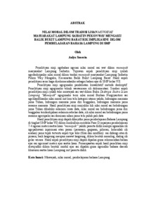 Penelitiyan sinji ngebahas ngenai nilai moral sai wat dilom muwayak masyarakat Lampung Saibatin. Tujuwan anjak penelitiyan sinji iyulah ngedeskripsiko nilai moral dilom tradisi muwayak masyarakat Lampung Saibatin Pekon Way Mengaku, Kecamatan Balik Bukit Lampung Barat. Hasil anjak penelitiyan seno haga direkomendasiko sebagai bahan ajar di SMP kelas VII. Penelitiyan sinji ngegunako pendekatan kuwalitatif metode deskriptif. Penelitiyan sinji ngegunako teknik wawancara rik dokumentasi. Sumber anjak penelitiyan sinji iyulah teks muwayak sai wat dilom Buku Deskripsi Sastra Lisan Lampung “Muwayak” ngegunako teori nilai moral Burhan Nurgiyantoro sai ngeklasifikasiko nilai moral mit lom telu kategori utama yakdo, hubungan manusia jama Tuhan, hubungan manusia jama diri tenggalan, hubungan manusia jama sesama manusia. Hasil penelitiyan sinji nunjukko kik nilai moral sai behubungan jama Tuhan dihaluko selamon ruwa data, nilai moral sai behubungan jama diri tenggalan teridentipikasi selamon sebelas data, rik nilai moral sai behubungan jama sesama ngerupako sai dominan nihan jama telu puluh pak data. Hasil penelitiyan sinji dapok dikayitko jama pembelajaran Bahasa Lampung di tingkat SMP kelas VII dilom kurikullum merdeka Fase D capaiyan pembelajaran 7.4 ngenai materi sastra lisan “muwayak” yakdo peserta didik mampu nganalisa rik ngepaluwasi inpormasi atau pesan (perasaan, gagasan, pikeran, kehendak rik arahan) jama topik tertentu anjak tipe teks (fiksi dan nonfiksi) sai didengi atau di pirsani, baik langsung maupun mawat langsung, dilom bentuk monolog, dialog rik gelar wicara. Hasil anjak penelitiyan sinji dapok dipakai guna rekomendasi bahan ajar sai ngemuat materi ajar sastra lisan. Pemanpaatan anjak hasil penelitian sinji diwujudko dilom bentuk modul ajar sai dipakai guna ngenalko bahasa daerah khususni sastra lisan Lampung mit peserta didik. Kata kunci: Muwayak, nilai moral, pembelajaran bahasa Lampung Penelitian ini membahas tentang nilai-nilai moral yang terkandung dalam tradisi muwayak pada masyarakat Lampung Saibatin. Tujuan utama dari penelitian ini adalah untuk mendeskripsikan nilai-nilai moral dalam tradisi muwayak yang berkembang di Pekon Way Mengaku, Kecamatan Balik Bukit, Kabupaten Lampung Barat. Hasil dari penelitian ini diharapkan dapat direkomendasikan sebagai bahan ajar untuk siswa kelas VII tingkat SMP. Penelitian ini menggunakan pendekatan kualitatif dengan metode deskriptif. Penelitian ini menggunakan teknik wawancara dan dokumentasi. Sumber data penelitian berasal dari teks muwayak yang terdapat dalam buku Deskripsi Sastra Lisan Lampung “Muwayak”, dengan menggunakan teori nilai moral dari Burhan Nurgiyantoro. Dalam teori tersebut, nilai moral diklasifikasikan ke dalam tiga kategori utama yaitu hubungan manusia dengan Tuhan, hubungan manusia dengan diri sendiri, dan hubungan manusia dengan sesama. Berdasarkan hasil analisis, ditemukan bahwa nilai moral yang berkaitan dengan hubungan kepada Tuhan muncul sebanyak dua data, nilai yang berhubungan dengan diri sendiri ditemukan sebanyak sebelas data, dan nilai yang berkaitan dengan sesama manusia merupakan yang paling dominan, yaitu sebanyak tiga puluh empat data. Temuan penelitian ini relevan untuk diintegrasikan ke dalam pembelajaran Bahasa Lampung pada tingkat SMP kelas VII, khususnya dalam implementasi Kurikulum Merdeka Fase D capaian pembelajaran 7.4. Materi sastra lisan muwayak dapat digunakan untuk melatih peserta didik dalam menganalisis serta mengevaluasi informasi atau pesan yang mencakup perasaan, ide, pikiran, kehendak, dan arahan berdasarkan topik tertentu dari teks fiksi maupun nonfiksi yang didengar atau ditonton, baik secara langsung maupun tidak langsung, dalam bentuk monolog, dialog, maupun gelar wicara. Hasil penelitian ini dapat dijadikan sebagai rekomendasi pengembangan bahan ajar berupa modul pembelajaran yang memuat materi sastra lisan, guna memperkenalkan dan melestarikan bahasa daerah, khususnya sastra lisan Lampung kepada peserta didik. Kata Kunci: Muwayak, nilai moral, pembelajaran Bahasa Lampung This research discusses the moral values contained in the muwayak tradition in the Lampung Saibatin community. The main objective of this study is to describe the moral values in the muwayak tradition that developed in Pekon Way Mengaku, Balik Bukit District, West Lampung Regency. The results of this study are expected to be recommended as teaching materials for grade VII junior high school students. This research uses a qualitative approach with a descriptive method. This research uses interview and documentation techniques. The source of research data comes from the muwayak text contained in the book Description of Lampung Oral Literature "Muwayak", using the theory of moral values from Burhan Nurgiyantoro. In this theory, moral values are classified into three main categories, namely: the relationship between humans and God, the relationship between humans and themselves, and the relationship between humans and others. Based on the results of the analysis, it was found that moral values related to the relationship with God appeared as many as two data, values related to oneself were found as many as eleven data, and values related to fellow humans were the most dominant, namely thirtyfour data. The findings of this study are relevant to be integrated into Lampung language learning at the 7th grade junior high school level, especially in the implementation of the Merdeka Curriculum Phase D learning achievement 7.4. Muwayak oral literature material can be used to train students in analyzing and evaluating information or messages that include feelings, ideas, thoughts, desires, and directions based on certain topics from fictional or non- fiction texts that are heard or watched, either directly or indirectly, in the form of monologues, dialogues, or talk shows. The results of this study can be used as recommendations for the development of teaching materials in the form of learning modules containing ora