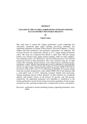This study aims to analyze the nutmeg agribusiness system comprising five subsystems: production input supply, farming, processing, marketing, and supporting institutions in Gedong Tataan District, Pesawaran Regency. A survey method with both quantitative and qualitative approaches was employed. The research location was purposively selected as it is a major nutmeg production center. The study was conducted from March to April 2024. Fifty-five nutmeg farmers were selected using simple random sampling, while two input suppliers, four collecting traders, two wholesalers, and one nutmeg processor were selected purposively based on field information. Data were analyzed using the six-right criteria, R/C, marketing channel analysis, value-added analysis, marketing margin, and farmer’s share. Results showed that the provision of fertilizers and pesticides met the six-right criteria. Nutmeg farming yielded an income of IDR 34.585.266,22 per hectare with an R/C ratio of 3.83, indicating profitability. Processing nutmeg seeds into essential oil generated a value added of IDR 2.861,45 per kilogram with a value-added ratio of 4.67%, indicating economic benefits from processing. Nutmeg marketing consists of three channels; all three channels are considered efficient with farmer's shares of 90 percent, 95 percent, and 100 percent, respectively. Six supporting institutions were identified as contributors to the nutmeg agribusiness system: farmer group associations (gapoktan), farmer groups, extension services, agricultural input stores, transportation services, and markets. Keywords: agribusiness, income, marketing, nutmeg, supporting institutions, value added. Penelitian ini bertujuan untuk menganalisis sistem agribisnis pala yang mencakup lima subsistem, yaitu pengadaan sarana produksi, usahatani, pengolahan, pemasaran, dan lembaga penunjang di Kecamatan Gedong Tataan, Kabupaten Pesawaran. Penelitian dilakukan dengan metode survei menggunakan pendekatan kuantitatif dan kualitatif. Lokasi penelitian dipilih secara sengaja (purposive) karena merupakan sentra produksi pala di Kabupaten Pesawaran. Pengambilan data dilaksanakan pada Maret hingga April 2024. Sebanyak 55 petani pala dipilih sebagai responden dengan metode simple random sampling, sedangkan 2 penyedia sarana produksi, 4 pedagang pengumpul, 2 pedagang besar, dan 1 pengolah pala ditentukan secara purposive berdasarkan informasi lapangan. Data dianalisis menggunakan metode analisis kriteria enam tepat, R/C, saluran pemasaran, nilai tambah, marjin pemasaran, dan farmer’s share. Hasil penelitian menunjukkan bahwa penyediaan pupuk dan pestisida telah memenuhi kriteria enam tepat. Pendapatan usahatani pala mencapai Rp34.585.266,22 per hektar dengan R/C atas biaya total sebesar 3,83 yang menunjukkan bahwa usahatani menguntungkan. Pengolahan biji pala menjadi minyak atsiri menghasilkan nilai tambah sebesar Rp2.861,45/kg dengan rasio nilai tambah 4,67 persen, yang mencerminkan adanya keuntungan dari proses pengolahan. Pemasaran pala terdiri atas tiga saluran; ketiga saluran dinilai efisien dengan farmer’s share masing-masing sebesar 90 persen, 95 persen, 100 persen. Enam lembaga penunjang teridentifikasi berperan dalam sistem agribisnis pala, yaitu gapoktan, kelompok tani, lembaga penyuluhan, toko sarana pertanian, transportasi, dan pasar. Kata kunci: agribisnis, lembaga penunjang, nilai tambah, pala, pemasaran, pendapatan.
