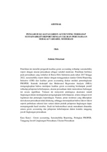 Penelitian ini meneliti pengaruh kualitas green accounting terhadap sustainability report dengan ukuran perusahaan sebagai variabel moderasi. Penelitian berfokus pada perusahaan yang terdaftar di Bursa Efek Indonesia pada tahun 2017 hingga 2022, sustainability report diukur dengan menggunakan standar Global Reporting Initiative (GRI) dan kualitas green accounting diukur melalui pemeringkatan PROPER. Statistik deskriptif dan Moderated Regression Analysis (MRA) mengungkapkan bahwa meskipun kualitas green accounting berdampak positif terhadap pelaporan keberlanjutan, ukuran perusahaan tidak memoderasi hubungan ini secara signifikan. Temuan ini menyoroti pentingnya akuntansi ramah lingkungan dalam meningkatkan pengungkapan keberlanjutan, selaras dengan teori legitimasi dan pemangku kepentingan. Namun, peran moderasi yang diharapkan dari ukuran perusahaan tidak didukung, sehingga menunjukkan bahwa faktor-faktor seperti perbedaan sektoral dan variasi dalam praktik pelaporan lingkungan dapat mempengaruhi hasil tersebut. Studi ini berkontribusi untuk memahami dinamika antara green accounting dan pelaporan keberlanjutan dalam konteks tanggung jawab lingkungan perusahaan. Kata Kunci : Green accounting, Sustainability Reporting, Peringkat PROPER, Tanggung Jawab Lingkungan Perusahaan, Ukuran Perusahaan This research examines the influence of green accounting quality on sustainability reports with company size as a moderating variable. The research focuses on companies listed on the Indonesia Stock Exchange from 2017 to 2022, sustainability reports are measured using the Global Reporting Initiative (GRI) standards and green accounting quality is measured through the PROPER ranking. Descriptive statistics and Moderated Regression Analysis (MRA) reveal that although green accounting quality has a positive impact on sustainability reporting, company size does not significantly moderate this relationship. These findings highlight the importance of green accounting in improving sustainability disclosure, in line with legitimacy and stakeholder theory. However, the expected moderating role of firm size is not supported, suggesting that factors such as sectoral differences and variations in environmental reporting practices may influence the results. This study contributes to understanding the dynamics between green accounting and sustainability reporting in the context of corporate environmental responsibility. Keywords : Green accounting, Sustainability Reporting, PROPER Ratings, Corporate Environmental Responsibility, Company Size