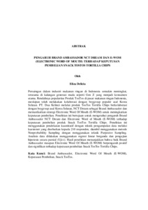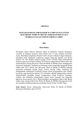 Persaingan dalam industri makanan ringan di Indonesia semakin meningkat, terutama di kalangan generasi muda seperti Gen Z yang menjadi konsumen utama. Rendahnya popularitas Produk TosTos di pasar makanan ringan Indonesia, meskipun telah melakukan kolaborasi dengan boygroup populer asal Korea Selatan. PT. Dua Kelinci melalui produk TosTos Tortilla Chips berkolaborasi dengan boygroup asal Korea Selatan, NCT Dream sebagai Brand Ambassador dan memanfaatkan strategi Electronic Word Of Mouth (E-WOM) untuk meningkatkan keputusan pembelian. Penelitian ini bertujuan untuk mengetahui pengaruh Brand Ambassador NCT Dream dan Electronic Word of Mouth (E-WOM) terhadap keputusan pembelian produk Snack TosTos Tortilla Chips. Penelitian ini menggunakan pendekatan kuantitatif dengan teknik pengumpulan data melalui kuesioner yang disebarkan kepada 210 responden, diambil menggunakan metode Nonprobability Sampling dengan menggunakan teknik Purposive Sampling. Analisis data dilakukan menggunakan regresi linear berganda dan pengujian hipotesis secara parsial (Uji-t). Hasil penelitian menunjukkan bahwa baik Brand Ambassador maupun Electronic Word Of Mouth (E-WOM) berpengaruh positif dan signifikan terhadap keputusan pembelian Snack TosTos Tortilla Chips. Kata Kunci: Brand Ambassador, Electronic Word Of Mouth (E-WOM), Keputusan Pembelian, Snack TosTos. Competition in the snack food industry in Indonesia is increasingly intense, especially among the younger generation such as Gen Z, who are the main consumers. The low popularity of the TosTos product in the Indonesian snack market persists despite its collaboration with a popular South Korean boygroup. PT. Dua Kelinci, through its product TosTos Tortilla Chips, collaborated with the South Korean boygroup NCT Dream as a Brand Ambassador and utilized the strategy of Electronic Word of Mouth (E-WOM) to increase purchase decisions. This study aims to determine the influence of NCT Dream as a Brand Ambassador and Electronic Word of Mouth (E-WOM) on the purchase decision of TosTos Tortilla Chips. This research uses a quantitative approach, with data collected through questionnaires distributed to 210 respondents using a non-probability sampling method with purposive sampling technique. Data analysis was conducted using multiple linear regression and hypothesis testing using partial (t- test) analysis. The results show that both the Brand Ambassador and Electronic Word of Mouth (E-WOM) have a positive and significant influence on the purchase decision of TosTos Tortilla Chips. Keywords: Brand Ambassador, Electronic Word of Mouth (E-WOM), Purchase Decision, TosTos Snack.