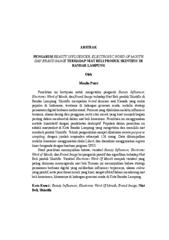 Penelitian ini bertujuan untuk mengetahui pengaruh Beauty Influencer, Electronic Word of Mouth, dan Brand Image terhadap Niat Beli produk Skintific di Bandar Lampung. Skintific merupakan brand skincare asal Kanada yang mulai populer di Indonesia, terutama di kalangan generasi muda, melalui strategi pemasaran digital berbasis media sosial. Promosi yang dilakukan melalui influencer ternama, ulasan daring dari pengguna, serta citra merek yang kuat menjadi bagian penting dalam membentuk dalam niat beli konsumen. Penelitian ini menggunakan metode kuantitatif dengan pendekatan deskriptif. Populasi dalam penelitian ini adalah masyarakat di Kota Bandar Lampung yang mengetahui dan memiliki niat membeli produk Skintific. Teknik pengambilan sampel dilakukan secara purposive sampling, dengan jumlah responden sebanyak 126 orang. Data dikumpulkan melalui kuesioner menggunakan skala Likert, dan dianalisis menggunakan regresi linier berganda dengan bantuan program SPSS. Hasil penelitian menunjukkan bahwa, variabel Beauty Influencer, Electronic Word of Mouth, dan Brand Image berpengaruh positif dan signifikan terhadap Niat Beli produk Skintific. Variabel Electronic Word Of Mouth menjadi variabel yang paling dominan memengaruhi niat beli.Temuan ini menunjukkan bahwa strategi pemasaran berbasis digital yang melibatkan influencer terpercaya, ulasan online yang positif, serta pencitraan merek yang kuat, sangat efektif dalam mendorong niat beli konsumen, khususnya di kalangan generasi muda di Kota Bandar Lampung. Kata Kunci : Beauty Influencer, Electronic Word Of Mouth, Brand Image, Niat Beli, Skintific This research aims to find out the influence of Beauty Influencer, Electronic Word of Mouth, and Brand Image on the Intention to Buy Skintific products in Bandar Lampung. Skintific is a skincare brand from Canada that is becoming popular in Indonesia, especially among the younger generation, through a social media-based digital marketing strategy. Promotions carried out through well- known influencers, online reviews from users, and a strong brand image are an important part of shaping consumer buying intentions. This research uses a quantitative method with a descriptive approach. The population in this study is people in Bandar Lampung City who know and have the intention to buy Skintific products. The sampling technique was carried out by purposive sampling, with a total of 126 respondents. Data is collected through questionnaires using the Likert scale, and analyzed using multiple linear regression with the help of the SPSS program. Research results show that, the variables of Beauty Influencer, Electronic Word of Mouth, and Brand Image have a positive and significant effect on the Purchase Intention of Skintific products. The Electronic Word Of Mouth variable is the most dominant variable that affects buying intentions. This finding shows that digital- based marketing strategies involving trusted influencers, positive online reviews, and strong branding, are very effective in encouraging consumers' buying intentions, especially among the younger generation in Bandar Lampung City. Keywords: Beauty Influencer, Electronic Word of Mouth, Brand Image, Purchase Intention, Skintific