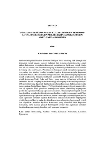 Pertumbuhan perekonomian Indonesia sebagian besar didorong oleh peningkatan konsumsi rumah tangga. Industri makanan dan minuman tumbuh paling cepat akibat dari adanya peningkatan konsumsi rumah tangga. Salah satu contoh bisnis dari sub sektor makanan dan minuman yang berkembang di Indonesia adalah bisnis di bidang toko roti/bakery. Penelitian ini bertujuan untuk mengetahui pengaruh rebranding dan kualitas produk terhadap loyalitas konsumen melalui kepuasan konsumen Mako Cake and Bakery sebagaimediasi. Jenis penelitian yang digunakan adalah explanatory dengan pendekatan kuantitatif. Populasi pada penelitian ini adalah konsumen Mako Cake and Bakery yang tersebar di berbagai wilayah di Indonesia. Teknik sampling ditentukan menggunakan purposive sampling sebanyak 385 responden yang diperoleh dari hasil penyebaran kuesioner. Teknik analisis data menggunakan Partial Least Square (PLS) meliputi uji outer model, uji inner model, dan uji hipotesis. Hasil penelitian menunjukkan bahwa rebranding berpengaruh positif dan signifikan terhadap kepuasan konsumen, rebranding berpengaruh positif dan signifikan terhadap loyalitas konsumen, kualitas produk berpengaruh positif dan signifikan terhadap kepuasan konsumen, namun kualitas produk berpengaruh positif tidak signifikan terhadap loyalitas konsumen, kepuasan konsumen berpengaruh positif dan signifikan terhadap loyalitas konsumen, rebranding berpengaruh positif dan signifikan terhadap loyalitas konsumen yang dimediasi oleh kepuasan konsumen, serta kualitas produk berpengaruh positif dan signifikan terhadap loyalitas konsumen yang dimediasi oleh kepuasan konsumen. Kata kunci: Rebranding, Kualitas Produk, Kepuasan Konsumen, Loyalitas Konsumen. Indonesia's economic growth is largely driven by increased household consumption. The food and beverage industry is growing the fastest due to increased household consumption. One example of a business from the food and beverage sub-sector that is developing in Indonesia is the bakery business. This research aims to determine the effect of rebranding and product quality on consumer loyaltywhich is mediated by Mako Cake and Bakery consumer satisfaction. The type of research used is explanatory with a quantitative approach. The population in this research were Mako Cake and Bakery consumers spread across various regions in Indonesia. The sampling technique was determined using purposive sampling of 385 respondents obtained from the results of distributing questionnaires. The data analysis technique used Partial Least Square (PLS) including outer model tests, inner model tests, and hypothesis tests. The results of the research indicate that rebranding has a positive and significant effect on consumer satisfaction, rebranding has a positive and significant effect on consumer loyalty, product quality has a positive and significant effect on consumer satisfaction, but product quality has a positive but not significant effect on consumer loyalty, consumer satisfaction has a positive and significant effect on consumer loyalty, rebranding has a positive and significant effect on consumer loyalty mediated by consumer satisfaction, and product quality has a positive and significant effect on consumerloyalty mediated by consumer satisfaction. Keywords: Rebranding, Product Quality, Consumer Satisfaction, Consumer Loyalty.
