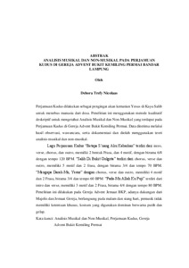 ABSTRAK Perjamuan Kudus dilakukan sebagai pengingat akan kematian Yesus di Kayu Salib untuk menebus manusia dari dosa. Penelitian ini menggunakan metode kualitatif deskriptif untuk mengetahui Analisis Musikal dan Non-Musikal yang terdapat pada Perjamuan Kudus di Gereja Advent Bukit Kemiling Permai. Data diterima melalui hasil observasi, wawancara, serta dokumentasi dan diolah menggunakan teori analisis musikal dan non-musikal. Lagu Perjamuan Kudus “Betapa S’nang Aku Kabarkan” terdiri dari intro, verse, chorus, dan outro, memilki 2 bentuk Frasa, dan 4 motif, dengan birama 6/8 dengan tempo 120 BPM. “Salib Di Bukit Golgota” terdiri dari chorus, verse dan outro, memiliki 5 motif dan 2 frasa, dengan birama 3/4 dan tempo 70 BPM. “Mengapa Darah-Mu, Yesus” dengan chorus, verse dan outro, memiliki 4 motif dan 2 Frasa, birama 3/4 dan tempo 60 BPM. “Pada-Mu Allah Ku Puji” terdiri dari intro dan verse, memiliki 3 motif dan 2 Frasa, birama 4/4 dengan tempo 80 BPM. Penelitian ini dilakukan pada Gereja Advent Jemaat BKP, adanya dukungan dari Majelis dan Jemaat Gereja, berlangsung pada malam dan siang hari, pemusik tidak memiliki ketentuan khusus, kostum yang digunakan dominan berwarna putih dan gelap. Kata kunci: Analisis Musikal dan Non-Musikal, Perjamuan Kudus, Gereja Advent Bukit Kemiling Permai ABSTRACT The Holy Communion is held as a reminder of Jesus' death on the Cross to redeem humans from sin. This study uses a descriptive qualitative method to determine the Musical and Non-Musical Analysis found in the Holy Communion at the Bukit Kemiling Permai Adventist Church. Data were received through observation, interviews, and documentation and processed using musical and non-musical analysis theories. The Holy Communion song "Betapa S'nang Aku Kabarkan" consists of an intro, verse, chorus, and outro, has 4 phrase forms, and 2 motifs, with a 6/8 time signature with a tempo of 120 BPM. "Salib Di Bukit Golgota" consists of a chorus, verse and outro, has 5 motifs and 2 phrases, with a 3/4 time signature and a tempo of 70 BPM. "Mengapa Darah-Mu, Yesus" with a chorus, verse and outro, has 4 motifs and 2 phrases, a 3/4 time signature and a tempo of 60 BPM. “Pada-Mu Allah Ku Puji” consists of an intro and verse, has 3 motifs and 2 phrases, 4/4 time signature with a tempo of 80 BPM. This research was conducted at the Bukit Kemiling Permai Adventist Church, with the support of the Church Council and Congregation, taking place at night and during the day, the musicians do not have special provisions, the costumes used are predominantly white and dark. Keywords: Musical and Non-Musical Analysis, Holy Communion, Bukit Kemiling Permai Adventist Church