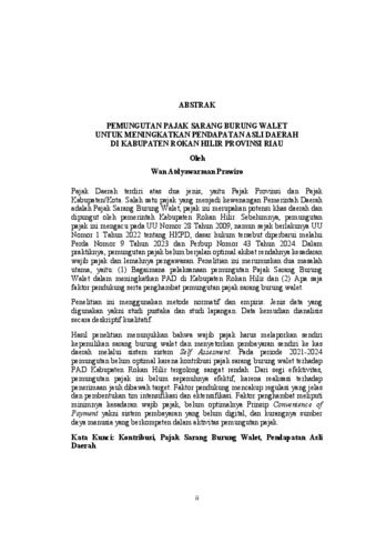 ABSTRAK Pajak Daerah terdiri atas dua jenis, yaitu Pajak Provinsi dan Pajak Kabupaten/Kota. Salah satu pajak yang menjadi kewenangan Pemerintah Daerah adalah Pajak Sarang Burung Walet, pajak ini merupakan potensi khas daerah dan dipungut oleh pemerintah Kabupaten Rokan Hilir. Sebelumnya, pemungutan pajak ini mengacu pada UU Nomor 28 Tahun 2009, namun sejak berlakunya UU Nomor 1 Tahun 2022 tentang HKPD, dasar hukum tersebut diperbarui melalui Perda Nomor 9 Tahun 2023 dan Perbup Nomor 43 Tahun 2024. Dalam praktiknya, pemungutan pajak belum berjalan optimal akibat rendahnya kesadaran wajib pajak dan lemahnya pengawasan. Penelitian ini merumuskan dua masalah utama, yaitu: (1) Bagaimana pelaksanaan pemungutan Pajak Sarang Burung Walet dalam meningkatkan PAD di Kabupaten Rokan Hilir dan (2) Apa saja faktor pendukung serta penghambat pemungutan pajak sarang burung walet. Penelitian ini menggunakan metode normatif dan empiris. Jenis data yang digunakan yakni studi pustaka dan studi lapangan. Data kemudian dianalisis secara deskriptif kualitatif. Hasil penelitian menunjukkan bahwa wajib pajak harus melaporkan sendiri kepemilikan sarang burung walet dan menyetorkan pembayaran sendiri ke kas daerah melalui sistem sistem Self Assesment. Pada periode 2021-2024 pemungutan belum optimal karena kontribusi pajak sarang burung walet terhadap PAD Kabupaten Rokan Hilir tergolong sangat rendah. Dari segi efektivitas, pemungutan pajak ini belum sepenuhnya efektif, karena realisasi terhadap penerimaan jauh dibawah target. Faktor pendukung mencakup regulasi yang jelas dan pembentukan tim intensifikasi dan ektensifikasi. Faktor penghambat meliputi minimnya kesadaran wajib pajak, belum optimalnya Prinsip Convenience of Payment yakni sistem pembayaran yang belum digital, dan kurangnya sumber daya manusia yang berkompeten dalam aktivitas pemungutan pajak. Kata Kunci: Kontribusi, Pajak Sarang Burung Walet, Pendapatan Asli Daerah iii ABSTRACT Regional taxes consist of two types, namely Provincial Tax and Regency/City Tax. One of the taxes under the authority of the Regional Government is the Edible Bird's Nest Tax. This tax is a unique regional potential and is levied by the Rokan Hilir Regency Government. Previously, the collection of this tax was governed by Law Number 28 of 2009. However, since the enactment of Law Number 1 of 2022 concerning Financial Relations Between the Central Government and Regional Governments, the legal basis has been updated through Regional Regulation Number 9 of 2023 and Regent Regulation Number 43 of 2024. In practice, tax collection has not been optimally implemented due to low taxpayer compliance and weak supervision. This study formulates two main research questions: (1) How is the implementation of Edible Bird's Nest Tax collection in increasing Local Revenue (PAD) in Rokan Hilir Regency? and (2) What are the supporting and inhibiting factors in edible bird's nest tax collection? This research employs normative and empirical methods. The data types consist of literature studies and field studies. The data were then analyzed using qualitative descriptive analysis. The research findings indicate that taxpayers must self-report their edible bird's nest ownership and independently remit payments to the regional treasury through the Self Assessment system. During the 2021-2024 period, tax collection was not yet optimal as the edible bird's nest tax contribution to Rokan Hilir Regency's Local Own-Source Revenue (PAD) was classified as very low. In terms of effectiveness, the collection of this tax has not been fully effective, as the actual revenue falls far below the target. Supporting factors include clear regulations and the establishment of intensification and extensification teams. The inhibiting factors include low taxpayer compliance, suboptimal implementation of the Convenience of Payment principle (particularly the non-digital payment system), and the lack of qualified personnel in tax collection activities. Keywords: Contribution, Swiftlet Nest Tax, Local Own-Source Revenue.