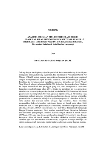 ABSTRAK Seiring dengan meningkatnya jumlah penduduk, kebutuhan terhadap air bersih pun mengalami peningkatan yang signifikan. Hal ini menuntut Perusahaan Daerah Air Minum (PDAM) untuk mampu menyediakan layanan air bersih secara optimal dengan memperhatikan aspek kualitas, kuantitas, dan kesinambungan pasokan. Penelitian ini bertujuan untuk menghitung proyeksi kebutuhan air bersih PDAM Way Rilau di wilayah pelayanan DMA G26 Kelurahan Sukabumi selama 20 tahun ke depan berdasarkan data pelanggan yang ada, serta menganalisis kecukupan kapasitas produksi hingga tahun 2044. Selain itu, penelitian ini juga mencakup simulasi dan evaluasi jaringan distribusi air bersih DMA G26 Kelurahan Sukabumi pada kondisi eksisting tahun 2024 menggunakan Epanet versi 2.2. Metodologi yang diterapkan meliputi proyeksi pertumbuhan pelanggan dengan metode aritmatika, geometri, dan eksponensial, dilanjutkan perhitungan proyeksi kebutuhan air bersih, serta analisis dan evaluasi sistem jaringan pipa distribusi. Hasil penelitian menunjukkan bahwa kebutuhan maksimum harian air bersih pada tahun 2044 mencapai 603.245 liter per hari (6,982 liter/detik), sementara kapasitas produksi eksisting sebesar 1.143.936 liter per hari (13,24 liter/detik) dinilai masih mencukupi hingga 20 tahun mendatang. Hasil analisis simulasi Epanet ditemukan beberapa masalah teknis pada jaringan, termasuk dua titik dengan tekanan di bawah standar (J372 dan J370), satu pipa dengan unit headloss tinggi (Pi356), serta 13 pipa dengan kecepatan aliran di bawah standar. Perbaikan dilakukan melalui penggantian diameter pipa dan penambahan head reservoir, yang hasil akhirnya menunjukkan sistem jaringan telah memenuhi standar pada kondisi jam normal dan jam puncak. Kata kunci: Epanet 2.2, Kebutuhan Air, Jaringan Distribusi, Perpipaan, PDAM ABSTRACT Along with the increasing population, the demand for clean water has also increased significantly. This requires Regional Drinking Water Companies (PDAMs) to be able to provide clean water services optimally by paying attention to aspects of quality, quantity, and continuity of supply. This study aims to calculate the projected clean water demand of PDAM Way Rilau in the service area of DMA G26 Kelurahan Sukabumi for the next 20 years based on existing customer data, and analyze the adequacy of production capacity until 2044. In addition, this research also includes simulation and evaluation of the water distribution network of DMA G26 Kelurahan Sukabumi under existing conditions in 2024 using Epanet version 2.2. The methodology applied includes projection of customer growth using arithmetic, geometric, and exponential methods, followed by calculation of projected water demand, and analysis and evaluation of the distribution pipe network system. The results showed that the maximum daily demand for clean water in 2044 reached 603,245 liters per day (6.982 liters/second), while the existing production capacity of 1,143,936 liters per day (13.24 liters/second) is considered sufficient for the next 20 years. The results of the Epanet simulation analysis found several technical problems in the network, including two points with substandard pressure (J372 and J370), one pipe with a high headloss unit (Pi356), and 13 pipes with substandard flow velocity. Improvements were made through the replacement of pipe diameters and the addition of reservoir heads, the end result of which showed that the network system had met the standards under normal and peak hour conditions. Keywords: Epanet 2.2, Water Demand, Distribution Network, Piping, PDAM