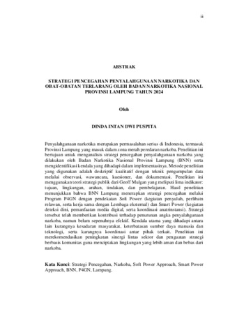 Dinda, Intan Dwi Puspita (2025) STRATEGI PENCEGAHAN PENYALAHGUNAAN NARKOTIKA DAN OBAT-OBATAN TERLARANG OLEH BADAN NARKOTIKA NASIONAL PROVINSI LAMPUNG TAHUN 2024. FAKULTAS ILMU SOSIAL DAN ILMU POLITIK, UNIVERSITAS LAMPUNG.