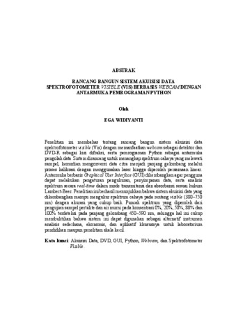 Penelitian ini membahas tentang rancang bangun sistem akuisisi data spektrofotometer visible (Vis) dengan memanfaatkan webcam sebagai detektor dan DVD-R sebagai kisi difraksi, serta pemrograman Python sebagai antarmuka pengolah data. Sistem dirancang untuk menangkap spektrum cahaya yang melewati sampel, kemudian mengonversi data citra menjadi panjang gelombang melalui proses kalibrasi dengan menggunakan laser hingga diperoleh persamaan linear. Antarmuka berbasis Graphical User Interface (GUI) dikembangkan agar pengguna dapat melakukan pengaturan pengukuran, penyimpanan data, serta analisis spektrum secara real-time dalam mode transmitansi dan absorbansi sesuai hukum Lambert-Beer. Penelitian ini berhasil menunjukkan bahwa sistem akuisisi data yang dikembangkan mampu mengukur spektrum cahaya pada rentang visible (380–750 nm) dengan akurasi yang cukup baik. Puncak spektrum yang diperoleh dari pengujian sampel pertalite dan air murni pada konsentrasi 0%, 20%, 50%, 80% dan 100% terdeteksi pada panjang gelombang 450–590 nm, sehingga hal ini cukup membuktikan bahwa sistem ini dapat digunakan sebagai alternatif instrumen analisis sederhana, ekonomis, dan aplikatif khususnya untuk laboratorium pendidikan maupun penelitian skala kecil. Kata kunci: Akuisisi Data, DVD, GUI, Python, Webcam, dan Spektrofotometer Visible.