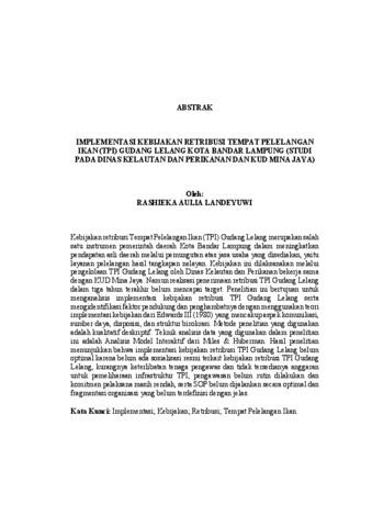 RASHIEKA , AULIA LANDEYUWI (2025) IMPLEMENTASI KEBIJAKAN RETRIBUSI TEMPAT PELELANGAN IKAN (TPI) GUDANG LELANG KOTA BANDAR LAMPUNG (STUDI PADA DINAS KELAUTAN DAN PERIKANAN DAN KUD MINA JAYA). FAKULTAS ILMU SOSIAL DAN ILMU POLITIK, UNIVERSITAS LAMPUNG.