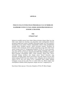 Indonesia memiliki potensi besar dalam bidang pertanian dengan lahan luas dan iklim tropis. Salah satu teknologi yang digunakan untuk meningkatkan efisiensi pertanian adalah boom sprayer, perangkat penyemprot pupuk cair yang umumnya dioperasikan secara manual. Namun, pengendalian manual sering menimbulkan masalah akibat kelelahan operator, seperti kerusakan tanaman. Penelitian ini bertujuan untuk merancang sistem otomasi pergerakan sayap pada model boom sprayer dengan skala 10:1 menggunakan Raspberry Pi Pico W, sensor ultrasonik, dan motor stepper. Sistem ini dirancang untuk menjaga ketinggian ideal sayap pada jarak 40 cm dari tanaman, dengan kontrol PID untuk memastikan stabilitas. Hasil pengujian menunjukkan bahwa sistem berfungsi dengan baik. Sensor ultrasonik mampu membaca data dengan akurat. Sensor ultrasonik yang digunakan memiliki tingkat akurasi dan presisi yang baik dengan rata-rata nilai akurasi sebesar 98,86% dan error sebesar 1,14%, sedangkan rata-rata nilai presisi sebesar 99,73% dan error sebesar 0.27%. Sedangkan motor stepper menjaga ketinggian sayap rata-rata pada 40,2 cm untuk kedua sisi. Motor stepper juga menunjukkan stabilitas dalam pergerakan, dengan rata-rata 31 langkah per cm. Kata Kunci: Boom sprayer, Ultrasonic, Raspberry Pi Pico W, Motor Stepper Indonesia has great potential in agriculture with large land and tropical climate. One of the technologies used to improve agricultural efficiency is the boom sprayer, a liquid fertilizer spraying device that is generally operated manually. However, manual control often causes problems due to operator fatigue, such as crop damage. This research aims to design a wing movement automation sistem on a 10:1 scale boom sprayer model using Raspberry Pi Pico W, ultrasonic sensors, and stepper motors. The sistem is designed to maintain the ideal height of the wings at a distance of 40 cm from the plants, with PID control to ensure stability. The test results show that the sistem functions properly. The ultrasonic sensor is able to read the data accurately. The ultrasonic sensor used has a good level of accuracy and precision with an average accuracy value of 98.86% and an error of 1.14%, while the average precision value is 99.73% and an error of 0.27%. Meanwhile, the stepper motor keeps the average wing height at 40.2 cm for both sides. The stepper motor also showed stability in movement, with an average of 31 steps per cm. Keywords: Boom sprayer, Ultrasonic, Raspberry Pi Pico W, Stepper Motor