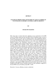 Penelitian ini bertujuan untuk menganalisis faktor-faktor yang memengaruhi porduksi ubi kayupada kelompok Pupuk NPK Singkong dan non NPK Singkong dan besarnya pendapatan masing-masing usahatani ubi kayu di Kecamatan Way Pengubuan Kabupaten Lampung Tengah. Lokasi penelitian ditentukan secara sengaja dengan alasan Kecamatan Way Pengubuan menjadi salah satu daerah adanya Program Makmur. Responden yang diperoleh sebanyak 31 petani kelompok Pupuk NPK Singkong dengan menggunakan metode sensus dan 65 petani kelompok pupuk non NPK Singkong dengan menggunakan metode sampel acak sederhana. Pengambilan data dilakukan pada bulan September 2024. Data dianalisis menggunakan fungsi produksi Cobb-Douglas, efisiensi produksi dan analisis pendapatan usahatani. Hasil penelitian menunjukan bahwa faktor-faktor produksi yang berpengaruh nyata dan positif terhadap produksi ubi kayu kelompok Pupuk NPK Singkong adalah luas lahan, jumlah bibit, perstisida, tenaga kerja, Pupuk NPK Singkong, pupuk kandang, dan varietas, sedangkan untuk kelompok pupuk non NPK Singkong adalah luas lahan, jumlah bibit, pestisida, tenaga kerja, pupuk urea, pupuk KCL, dan pupuk kandang. Usahatani ubi kayu belum efisien dan termasuk dalam skala usaha decreasing return to scale untuk kelompok NPK Singkong dan increasing return to scale untuk kelompok non NPK Singkong. Usahatani ubi kayu kelompok Pupuk NPK Singkong menguntungkan dengan keuntungan sebesar Rp 22.797.784,14 per hektar dan nilai R/C 2,57. Usahatani kelompok pupuk non NPK Singkong juga menguntungkan dengan keuntungan sebesar Rp 14.596.338,46 dan nilai R/C 1,97. Usahatani ubi kayu kelompok Pupuk NPK Singkong lebih menguntungkan dibanding dengan kelompok pupuk non NPK Singkong (B/C = 8,89). Kata kunci : efisiensi, pendapatan, produksi, ubi kayu This study aims to analyze the factors affecting cassava production in the NPK Cassava Fertilizer group and the non-NPK Cassava Fertilizer group, as well as the income levels of each cassava farming group in Way Pengubuan District, Central Lampung Regency. The research location was determined purposively on the grounds that Way Pengubuan District is one of the areas implementing the Makmur Program. The respondents consisted of 31 farmers from the NPK Cassava Fertilizer group, selected using the census method, and 65 farmers from the non-NPK Cassava Fertilizer group, selected using the simple random sampling method. Data collection was conducted in September 2024. The data were analyzed using the Cobb-Douglas production function, production efficiency analysis, and farm income analysis. The results showed that the production factors that had a significant and positive effect on cassava production in the NPK Cassava Fertilizer group were land area, number of seedlings, pesticides, labor, NPK Cassava Fertilizer, manure, and variety, while for the non-NPK Cassava Fertilizer group, the factors were land area, number of seedlings, pesticides, labor, urea fertilizer, KCL fertilizer, and manure. Cassava farming was found to be inefficient, with the NPK Cassava Fertilizer group operating under decreasing returns to scale and the non-NPK Cassava Fertilizer group under increasing returns to scale. Cassava farming in the NPK Cassava Fertilizer group was profitable, with a profit of IDR 22,797,784.14 per hectare and an R/C ratio of 2.57. Cassava farming in the non-NPK Cassava Fertilizer group was also profitable, with a profit of IDR 14,596,338.46 and an R/C ratio of 1.97. Cassava farming in the NPK Cassava Fertilizer group was more profitable compared to the non-NPK Cassava Fertilizer group (B/C = 8.89). Keywords : Cassava, efficiency, income, production