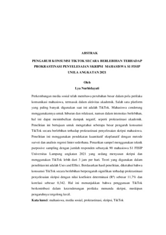 Lya , Nurhidayati (2025) PENGARUH KONSUMSI TIKTOK SECARA BERLEBIHAN TERHADAP PROKRASTINASI PENYELESAIAN SKRIPSI MAHASISWA S1 FISIP UNILA ANGKATAN 2021. FAKULTAS ILMU SOSIAL DAN ILMU POLITIK, UNIVERSITAS LAMPUNG.