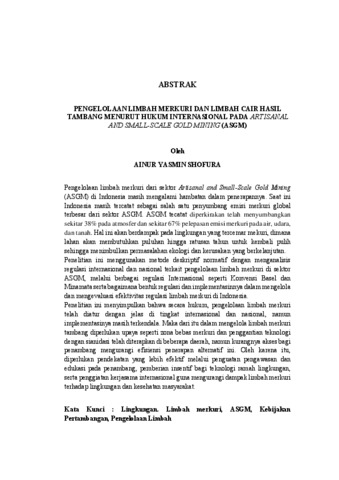 Ainur Yasmin Shofura, - (2025) PENGELOLAAN LIMBAH MERKURI DAN LIMBAH CAIR HASIL TAMBANG MENURUT HUKUM INTERNASIONAL PADA ARTISANAL AND SMALL-SCALE GOLD MINING (ASGM). FAKULTAS HUKUM, UNIVERSITAS LAMPUNG.