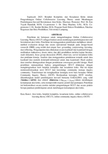 Penelitian ini bertujuan untuk mengembangkan Online Collaborative Learning Theory (OCLT) sebagai fondasi untuk membangun pembelajaran inovatif berorientasi aksi kritis. Penelitian ini menggunakan pendekatan multiphase mixed- method evaluation design dan secara operasional berpijak pada design-based research (DBR) yang terdiri dari empat fase: grounding, conjecturing, iterating, dan reflecting. Pengumpulan data dilakukan secara kualitatif dan kuantitatif dengan melibatkan mahasiswa, dosen mitra, dan ahli pendidikan melalui kajian literatur, studi dokumen, focus group discussion (FGD), observasi, survei kesadaran kritis dan penilaian kinerja. Analisis data menggunakan pendekatan tematik untuk data kualitatif dan statistik deskriptif-inferensial untuk data kuantitatif. Hasil analisis data tersebut diintegrasikan dengan pendekatan convergent parallel design. Hasil penelitian menunjukkan bahwa pengembangan OCLT dilakukan dengan mengintegrasikan teori berpikir kompleks dan kesadaran kritis. Hal ini dapat mentransformasikan teori OCLT dari knowledge community menuju inquiry community. Transformasi ini menghasilkan kerangka teori baru bernama Online Community Inquiry Theory (OCIT). Berdasarkan kerangka OCIT tersebut, dikembangkan model pembelajaran inovatif bernama SAKALIMA yang valid (Validitas = 0,8705) dan efektif (Efektivitas = Sig(0,00) < p(0,05)) dalam membangun kemampuan aksi kritis, serta memperoleh respons positif dari partisipan. Penelitian ini berkontribusi secara teoritis melalui pengembangan OCLT dan secara praktis berupa panduan pembelajaran untuk membangun kemampuan aksi kritis. Kata Kunci: Aksi kritis, berpikir kompleks, kesadaran kritis, online collaborative learning theory (OCLT), online community inquiry theory (OCIT) x ABSTRACT The present study aimed to develop Online Collaborative Learning Theory (OCLT) as a foundation to construct an innovative learning oriented toward critical action. The study employs a multiphase mixed-method evaluation design and operationally builds on design-based research (DBR) consisting of four phases: grounding, conjecturing, iterating, and reflecting. Data collection was conducted both qualitatively and quantitatively, involving students, lecturer partners, and education experts through literature reviews, document analysis, focus group discussions (FGD), observations, critical consciousness surveys, and performance assessments. Data analysis utilized a thematic approach for qualitative data and descriptive-inferential statistics for quantitative data. These analyses were integrated using a convergent parallel design approach. The results show that the development of OCLT was accomplished by integrating complex thinking theory and critical awareness, thus transforming the theory from a knowledge community toward an inquiry community. This transformation produced a new theoretical framework called Online Community Inquiry Theory (OCIT). Based on the OCIT framework, an innovative learning model named SAKALIMA was developed, which proved to be valid and effective in building critical action ability (Validity = 0,8705; Effectivity = Sig(0,00) < p(0,05)), and received positive responses from participants. This research contributes theoretically through the development of OCLT and practically through learning guidelines for building critical action capabilities. Keywords: Complex thinking, critical action, critical consciousness, online collaborative learning theory (OCLT), online community inquiry theory (OCIT)