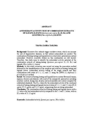TSANIA , ZAHRA TASLIMA (2025) UJI AKTIVITAS ANTIOKSIDAN KOMBINASI EKSTRAK DAUN KATANG-KATANG (Ipomoea pes-caprae (L.) R. Br.) DAN DAUN LEGUNDI (Vitex trifolia L.). FAKULTAS KEDOKTERAN, UNIVERSITAS LAMPUNG.