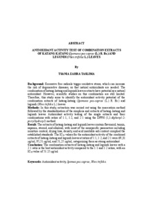 Latar Belakang: Radikal bebas yang berlebihan memicu stres oksidatif yang dapat meningkatkan risiko penyakit degeneratif sehingga diperlukannya antioksidan alami. Kombinasi ekstrak daun katang-katang dan daun legundi berpotensi sebagai antioksidan alami, namun penelitian secara ilmiahnya masih terbatas. Oleh karena itu, penelitian ini dilakukan bertujuan untuk mengidentifikasi potensi aktivitas antioksidan pada kombinasi ekstrak daun katang-katang (Ipomoea pes-caprae (L.) R. Br.) dan daun legundi (Vitex trifolia L.). Metode: Pada penelitian ini dilakukan ekstraksi dengan metode maserasi, dilanjutkan dengan standardisasi simplisia dan ekstrak daun katang-katang dan daun legundi. Pengujian aktivitas antioksidan ekstrak tunggal dan kombinasi ekstrak dengan formula kombinasi 1:1, 1:2, 2:1 menggunakan metode DPPH (1,1- diphenyl-2-picrylhydrazyl). Hasil: Ekstrak daun katang-katang dan daun legundi mengandung senyawa flavonoid, tanin, saponin, steroid, terpenoid, dan alkaloid, dengan sebagian besar parameter nonspesifik, yaitu kadar air, susut pengeringan, bobot jenis, dan kadar abu tidak larut asam telah memenuhi standar. Hasil nilai IC50 untuk pengukuran aktivitas antioksidan dari kombinasi ekstrak daun katang-katang dan daun legundi dengan perbandingan 1:1, 1:2, 2:1 adalah 69,31 μg/ml, 95,51 μg/ml, 51,25 μg/ml, yang termasuk ke dalam antioksidan kuat. Simpulan: Kombinasi ekstrak daun katang-katang dan daun legundi dengan perbandingan 2:1 merupakan formula kombinasi ekstrak terbaik dibandingkan dengan perbandingan 1:1 dan 1:2 dengan nilai IC50 sebesar 51,25 μg/ml. Kata kunci: Aktivitas Antioksidan, Ipomea pes caprae, Vitex trifolia. Background: Excessive free radicals trigger oxidative stress, which can increase the risk of degenerative diseases, so that natural antioxidants are needed. The combination of katang-katang and legundi leaves extracts have potential as a natural antioxidant. However, scientific studies on this combination are still limited. Therefore, this study aims to identify the antioxidant activity potential of the combination extracts of katang-katang (Ipomoea pes-caprae (L.) R. Br.) and legundi (Vitex trifolia L.) leaves. Methods: In this study, extraction was carried out using the maceration method followed by the standardization of the simplicia and extracts of katang-katang and legundi leaves. Antioxidant activity testing of the single extracts and their combinations with ratios of 1:1, 1:2, and 2:1 using the DPPH (1,1-diphenyl-2- picrylhydrazyl) method. Result: The extracts of katang-katang and legundi leaves contain flavonoid, tannin, saponin, steroid, and alkaloid, with most of the nonspecific parameters including moisture content, drying loss, density, and acid insoluble ash content complied the established standards. The IC50 values for the antioxidant activity of the combined extracts of katang-katang and legundi leaves at ratios of 1:1, 1:2, and 2:1 were 69,31 μg/ml, 95,51 μg/ml, and 51,25 μg/ml, categorizing them as strong antioxidant. Conclusion: The combination extracts of katang-katang and legundi leaves with a 2:1 ratio is the best antioxidant activity compared to the 1:1 and 1:2 ratios, with an IC50 value of 51.25 μg/ml. Keywords: Antioxidant activity, Ipomea pes caprae, Vitex trifolia.