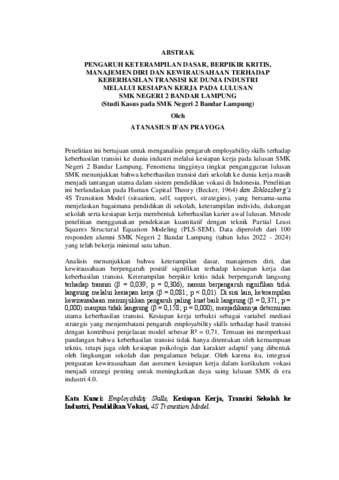 ATANASIUS IFAN, PRAYOGA (2025) PENGARUH KETERAMPILAN DASAR, BERPIKIR KRITIS, MANAJEMEN DIRI DAN KEWIRAUSAHAAN TERHADAP KEBERHASILAN TRANSISI KE DUNIA INDUSTRI MELALUI KESIAPAN KERJA PADA LULUSAN SMK NEGERI 2 BANDAR LAMPUNG (Studi Kasus pada SMK Negeri 2 Bandar Lampung). Masters thesis, UNIVERSITAS LAMPUNG.