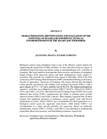 Qannitha, Shaffa Juliebe S (2025) KARAKTERISASI, IDENTIFIKASI, DAN UJI KEMAMPUAN JAMUR ENDOFIT TANAMAN TEBU SEBAGAI ENTOMOPATOGEN PENGGEREK BATANG TEBU. PERTANIAN, UNIVERSITAS LAMPUNG .
