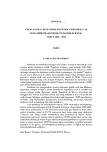 Penelitian ini membahas tentang China Global Television Network (CGTN) sebagai media diplomasi publik Tiongkok di Kenya pada periode 2020-2024. Sebagai media berita internasional yang dimiliki oleh pemerintah Tiongkok, CGTN berfungsi sebagai alat diplomasi publik dalam membangun citra positif Tiongkok di luar negeri, khususnya di Afrika. Kenya dipilih sebagai fokus penelitian karena posisinya sebagai salah satu pusat ekonomi dan media di Afrika Timur serta hubungan bilateral yang erat dengan Tiongkok. Penelitian ini kemudian akan menjelaskan bagaimana diplomasi publik Tiongkok di Kenya melalui media CGTN pada tahun 2020 sampai 2024. Penelitian ini menggunakan konsep diplomasi publik oleh Jan Melissen digunakan sebagai kerangka dalam memahami bagaimana CGTN memberikan narasi sebagai media diplomasi publik Tiongkok di Kenya. Penelitian ini menggunakan metode kualitatif melalui data yang didapatkan dari web resmi dan artikel jurnal. Sehingga penelitian ini berfokus pada bagaimana CGTN memberikan isi berita yang menunjukkan propaganda, nation branding, dan foreign cultrural realtions untuk mendukung diplomasi publiknya. Hasil penelitian ini menunjukkan bahwa CGTN memainkan peran penting dalam melakukan diplomasi publik Tiongkok di Kenya selama tahun 2020-2024. Pada unsur propaganda, CGTN menyoroti narasi yang pro Tiongkok. Pada unsur nation branding, narasi di CGTN menyoroti hasil kerja sama yang dilakukan Tiongkok dan Kenya untuk memperkuat citra positifnya di negara Kenya. Sedangkan pada unsur foreign cultural relations, CGTN memberikan narasi yang mendukung hubungan kedua negara melalui kerjasama perfilman, kegiatan festival budaya, hingga pariwisata. CGTN berperan dalam menyajikan perspektif alternatif terhadap isu-isu global, serta memperkuat hubungan antara Tiongkok dan Kenya melalui diplomasi publiknya. Kata Kunci: Tiongkok, Diplomasi Publik, CGTN, Kenya This study examines the China Global Television Network (CGTN) as a public diplomacy tool for China in Kenya from 2020 to 2024. As an international news outlet owned by the Chinese government, CGTN helps shape a positive image of China abroad, especially in Africa. Kenya was chosen as the focus of this research due to its role as a key economic and media hub in East Africa and its strong bilateral relations with China. This study explores how China utilizes CGTN for public diplomacy in Kenya during this period. This research adopts Jan Melissen’s concept of public diplomacy to understand how CGTN constructs its narratives as China’s public diplomacy medium in Kenya. The study employs a qualitative method, collecting data from official websites and journal articles. It focuses on how CGTN presents news content incorporating elements of propaganda, nation branding, and foreign cultural relations to support China’s public diplomacy efforts. The findings indicate that CGTN has played a significant role in China’s public diplomacy in Kenya from 2020 to 2024. In terms of propaganda, CGTN has promoted pro-China narratives. Regarding nation branding, CGTN has highlighted China-Kenya cooperation to enhance China’s positive image in Kenya. In the area of foreign cultural relations, CGTN has emphasized narratives about film collaborations, cultural festivals, and tourism to highlight the strong China-Kenya ties. Overall, CGTN provides an alternative perspective on global issues and contributes to strengthening China-Kenya relations through public diplomacy. Keywords: China, Public Diplomacy, CGTN, Kenya