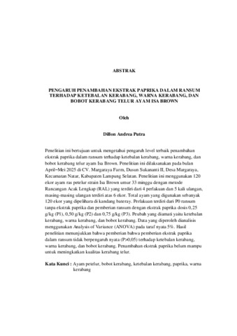Penelitian ini bertujuan untuk mengetahui pengaruh level terbaik penambahan ekstrak paprika dalam ransum terhadap ketebalan kerabang, warna kerabang, dan bobot kerabang telur ayam Isa Brown. Penelitian ini dilaksanakan pada bulan April–Mei 2025 di CV. Margaraya Farm, Dusun Sukananti II, Desa Margaraya, Kecamatan Natar, Kabupaten Lampung Selatan. Penelitian ini menggunakan 120 ekor ayam ras petelur strain Isa Brown umur 33 minggu dengan metode Rancangan Acak Lengkap (RAL) yang terdiri dari 4 perlakuan dan 5 kali ulangan, masing-masing ulangan terdiri atas 6 ekor. Total ayam yang digunakan sebanyak 120 ekor yang dipelihara di kandang bateray. Perlakuan terdiri dari P0 ransum tanpa ekstrak paprika dan pemberian ransum dengan ekstrak paprika dosis 0,25 g/kg (P1), 0,50 g/kg (P2) dan 0,75 g/kg (P3). Peubah yang diamati yaitu ketebalan kerabang, warna kerabang, dan bobot kerabang. Data yang diperoleh dianalisis menggunakan Analysis of Variance (ANOVA) pada taraf nyata 5%. Hasil penelitian menunjukkan bahwa pemberian bahwa pemberian ekstrak paprika dalam ransum tidak berpengaruh nyata (P>0,05) terhadap ketebalan kerabang, warna kerabang, dan bobot kerabang. Penambahan ekstrak paprika belum mampu untuk meningkatkan kualitas kerabang telur. Kata Kunci : Ayam petelur, bobot kerabang, ketebalan kerabang, paprika, warna kerabang This study aimed to determine the optimal level of paprika extract supplementation in the diet on eggshell thickness, eggshell color, and shell weight Isa Brown laying hens. The experiment was conducted in April–May 2025 at CV. Margaraya Farm, Dusun Sukananti II, Margaraya Village, Natar District, South Lampung Regency. A total of 120 laying hens of the Isa Brown strain at 33 weeks of age were used, following a Completely Randomized Design (CRD) consisting of 4 treatments with 5 replications, and each replication consisting of 6 birds. A total used 120 laying hens, reared in a battery cage system. The treatments consisted of P0 (diet without paprika extract), P1 (diet with 0.25 g/kg paprika extract), P2 (diet with 0.50 g/kg paprika extract), and P3 (diet with 0.75 g/kg paprika extract). The observed variables were eggshell thickness, eggshell color, and eggshell weight. The collected data were analyzed using Analysis of Variance (ANOVA) at a 5% significance level. The results showed that supplementation of paprika extract in the diet had no significant effect (P > 0.05) on eggshell thickness, eggshell color, and eggshell weight. Therefore, the addition of paprika extract was not effective in improving eggshell quality. Keywords : Laying hens, eggshell weight, eggshell thickness, paprika, eggshell color