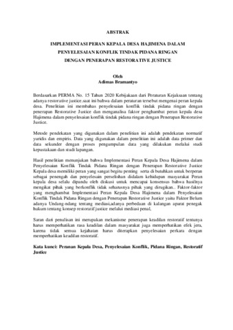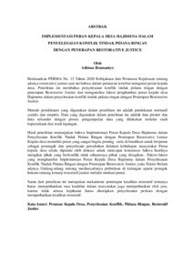 Berdasarkan PERMA No. 15 Tahun 2020 Kebijakaan dari Peraturan Kejaksaan tentang adanya restorative justice.saat ini bahwa dalam peraturan tersebut mengenai peran kepala desa. Penelitian ini membahas penyelesaian konflik tindak pidana ringan dengan penerapan Restorative Justice dan menganalisa faktor penghambat peran kepala desa Hajimena dalam penyelesaian konflik tindak pidana ringan dengan Penerapan Restorative Justice. Metode pendekatan yang digunakan dalam penelitian ini adalah pendekatan normatif yuridis dan empiris. Data yang digunakan dalam penelitian ini adalah data primer dan data sekunder dengan proses pengumpulan data yang dilakukan melalui studi kepustakaan dan studi lapangan. Hasil penelitian menunjukan bahwa Implementasi Peran Kepala Desa Hajimena dalam Penyelesaian Konflik Tindak Pidana Ringan dengan Penerapan Restorative Justice Kepala desa memiliki peran yang sangat begitu penting serta di butuhkan untuk berperan sebagai penengah dan penyelesain perselishan didalam kehidupan masyarakat Peran kepala desa selalu dipandu oleh diskusi untuk mencapai konsensus bahwa hasilnya mengikat pihak yang berkonflik tidak seharusnya pihak yang dirugikan.. Faktor-faktor yang menghambat Implementasi Peran Kepala Desa Hajimena dalam Penyelesaian Konflik Tindak Pidana Ringan dengan Penerapan Restorative Justice yaitu Faktor Belum adanya Undang-ndang tentang mediasi,adanya perbedaan di kalangan aparat penegak hukum tentang konsep restoratif justice melalui mediasi penal, Saran dari penulisan ini merupakan mekanisme penerapan keadilan restoratif tentunya harus memperhatikan rasa keadilan dalam masyarakat juga memperhatikan efek jera, karena tidak semua kejahatan harus diterapkan penyelesaian perkara dengan memperhatikan keadilan restoratif. Kata kunci: Peranan Kepala Desa, Penyelesaian Konflik, Pidana Ringan, Restoratif Justice Based on PERMA No. 15 of 2020, the policy of the Prosecutor's Office Regulation regarding the existence of restorative justice. at this time that in the regulation regarding the role of the village head. This study discusses the resolution of minor criminal conflicts with the application of Restorative Justice and analyzes the inhibiting factors of the role of the Hajimena village head in resolving minor criminal conflicts with the Application of Restorative Justice. The approach method used in this research is normative juridical and empirical approaches. The data used in this research are primary data and secondary data with the data collection process carried out through literature studies and field studies. The results showed that the Implementation of the Role of the Hajimena Village Head in Resolving Minor Criminal Conflicts with the Application of Restorative Justice The village head has a very important role and is needed to act as an arbiter and resolver of disputes in community life The role of the village head is always guided by discussions to reach a consensus that the results are binding on the conflicting parties who should not be the injured party. Factors that hinder the Implementation of the Role of the Hajimena Village Head in Resolving Minor Criminal Conflicts with the Application of Restorative Justice are Factors The absence of laws on mediation, differences among law enforcement officials about the concept of restorative justice through penal mediation, The suggestion of this writing is that the mechanism for implementing restorative justice must of course pay attention to the sense of justice in society and also pay attention to the deterrent effect, because not all crimes must be applied to case settlement by paying attention to restorative justice. Keywords: Role of Village Head, Conflict Resolution, Minor Crimes, Restorative Justice