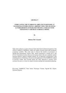 Time series analysis is used to forecast future data based on historical patterns. One effective method is SARIMAX, which can capture seasonal trends and incorporate exogenous variables. This study aims to forecast the number of passengers at Ngurah Rai International Airport, Bali, which experienced a decline due to the Covid-19 pandemic but has shown an increasing trend in the post-pandemic period. Seasonal patterns related to holiday periods are an important consideration in the modeling process. Referring to the successful application of the SARIMAX method in previous studies, this research adopts the same approach to produce more accurate forecasts as a basis for airport decision-making and operational planning. Keywords: SARIMAX, Time Series, Passenger Volume, Ngurah Rai Airport, Seasonal Patterns. Analisis deret waktu digunakan untuk memprediksi data masa depan berdasarkan pola historis. Salah satu metode yang efektif adalah SARIMAX, yang mampu menangkap pola musiman dan mempertimbangkan variabel eksogen. Studi ini bertujuan meramalkan jumlah penumpang di Bandara Internasional Ngurah Rai, Bali, yang sempat mengalami penurunan akibat pandemi Covid-19 namun menunjukkan tren peningkatan pasca pandemi. Pola musiman yang berkaitan dengan periode liburan menjadi pertimbangan penting dalam pemodelan. Mengacu pada keberhasilan metode SARIMAX dalam berbagai studi sebelumnya, penelitian ini menggunakan pendekatan tersebut guna menghasilkan prediksi yang lebih akurat sebagai dasar pengambilan keputusan dan perencanaan operasional bandara. Kata kunci: SARIMAX, Deret Waktu, Jumlah Penumpang, Bandara Ngurah Rai, Pola Musiman.