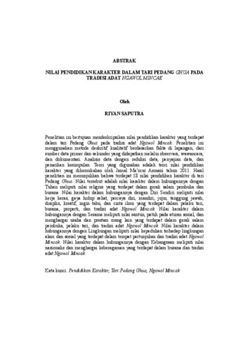 Penelitian ini bertujuan mendeskripsikan nilai pendidikan karakter yang terdapat dalam tari Pedang Ghua pada tradisi adat Ngawol Mincak. Penelitian ini menggunakan metode deskritif kualitatif berdasarkan fakta di lapangan, dari sumber data primer dan sekunder yang didapatkan melalui observasi, wawancara, dan dokumentasi. Analisis data dengan reduksi data, penyajian data, dan penarikan kesimpulan. Teori yang digunakan adalah teori nilai pendidikan karakter yang dikemukakan oleh Jamal Ma‟mur Asmani tahun 2011. Hasil penelitian ini menunjukkan bahwa terdapat 18 nilai pendidikan karakter di tari Pedang Ghua. Nilai tersebut adalah nilai karakter dalam hubungannya dengan Tuhan meliputi nilai religius yang terdapat dalam gerak salam pembuka dan busana. Nilai karakter dalam hubungannya dengan Diri Sendiri meliputi nilai kerja keras, gaya hidup sehat, percaya diri, mandiri, jujur, tanggung jawab, disiplin, kreatif, ingin tahu, dan cinta ilmu yang terdapat dalam pelaku tari, busana, properti, dan tradisi adat Ngawol Mincak. Nilai karakter dalam hubungannya dengan Sesama meliputi nilai santun, patuh pada aturan sosial, dan menghargai usaha dan prestasi orang lain yang terdapat dalam gerak salam pembuka, pelaku tari, dan tradisi adat Ngawol Mincak. Nilai karakter dalam hubungannya dengan Lingkungan meliputi nilai kepedulian terhadap lingkungan alam dan sosial yang terdapat dalam tempat pertunjukan dan tradisi adat Ngawol Mincak. Nilai karakter dalam hubungannya dengan Kebangsaan meliputi nilai nasionalis dan menghargai keberagaman yang terdapat dalam busana adat Ngawol Mincak. Kata kunci: Pendidikan Karakter, Tari Pedang Ghua, Ngawol Mincak This study aims to describe the values of character education contained in the Pedang Ghua dance in the Ngawol Mincak traditional tradition. This study uses a qualitative descriptive method based on facts in the field, from primary and secondary data sources obtained through observation, interviews, and documentation. Data analysis with data reduction, data presentation, and drawing conclusions. The theory used is the theory of character education values put forward by Jamal Ma'mur Asmani in 2011. The results of this study indicate that there are 18 values of characters education in the Pedang Ghua dance. These values are character values in relation to God, including religious values contained in the opening greeting and costumes. Character values in relation to one self include the values of hard work, healthy lifestyle, self-confidence, independence, honesty, responsibility, discipline, creativity, curiosity, and love of science contained in the dancers, costumes, properties, and Ngawol Mincak traditional costumes. Character values in relation to others include the values of politeness, obedience to social rules, and respect for the efforts and achievements of others contained in the opening speech, dancers, and customs of Ngawol Mincak. Character values in relation to the Environment include the values of caring for the natural environment and the social environment contained in the performance venue and customs of Ngawol Mincak. Character values in relation to Nationality include the values of nationalism and respect for diversity contained in the traditional clothing and customs of Ngawol Mincak. Key words: Character Education, Pedang Ghua Dance, Ngawol Mincak