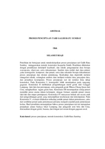 Penelitian ini bertujuan untuk mendeskripsikan proses penciptaan tari Galih Ratu Sumbay menggunakan metode konstruksi Jacquelin Smith. Penelitian dilakukan dengan pendekatan deskriptif kualitatif, dan teknik pengumpulan data berupa wawancara, observasi, serta dokumentasi. Sumber data terdiri dari data primer yaitu koreografer, komposer, dan penari, serta data sekunder berupa dokumentasi proses penciptaan dan elemen pendukung. Keabsahan data diperoleh melalui triangulasi teknik, sedangkan analisis data meliputi reduksi data, penyajian data, dan penarikan kesimpulan. Proses penciptaan tari ini melalui lima tahap konstruksi. Pada Konstruksi I, koreografer lebih menekankan pada rangsang gagasan. Konstruksi II melibatkan pengembangan motif gerak dari Cangget Lampung laki-laki dan perempuan, serta pengaruh gerak Whusu Chang Quan dari Cina, menghasilkan ragam gerak baru. Konstruksi III menempatkan setiap penari memiliki peran utama dalam kelompok, dengan formasi sepuluh penari (enam laki-laki dan empat perempuan). Konstruksi IV menyusun bentuk tari secara utuh dari pengembangan gerak yang menampilkan keselarasan dan kekompakan. Pada Konstruksi V, evaluasi dilakukan terhadap jumlah penari dalam pementasan, yaitu dari sembilan penari pada pementasan pertama menjadi sepuluh pada pementasan kedua. Hasil penelitian menunjukkan bahwa proses penciptaan tari ini merupakan perpaduan antara budaya lokal Lampung dan pengaruh seni bela diri Cina, disesuaikan dengan gerak, busana, dan iringan tari sesuai dengan gagasan awal. Kata kunci: proses penciptaan, metode konstruksi, Galih Ratu Sumbay This study aims to describe the creation process of the Galih Ratu Sumbay dance using Jacqueline Smith’s construction method. A qualitative descriptive approach was employed, with data collected through interviews, observations, and documentation. The primary data sources included the choreographer, composer, and dancers, while secondary sources consisted of documentation related to the creative process and supporting elements. Data validity was ensured through triangulation techniques, and data analysis involved data reduction, data presentation, and conclusion drawing. The creation process followed five stages of construction. In Construction I, the choreographer focused primarily on idea stimulation. Construction II involved the development of movement motifs derived from male and female Cangget Lampung dances, along with movements inspired by Chinese Whusu Chang Quan, resulting in new movement variations. Construction III emphasized the role of each dancer within the group, comprising ten dancers—six male and four female. Construction IV focused on structuring the complete form of the dance by harmonizing and synchronizing movements. Finally, Construction V consisted of the evaluation stage, where the choreographer reviewed the addition of dancers, increasing the number from nine in the initial performance to ten in the subsequent one. The results reveal that the Galih Ratu Sumbay dance creation process integrates local Lampung cultural elements with influences from Chinese martial arts, adjusted to the movement, costumes, and dance accompaniment according to the initial idea. Keywords: creation process, construction method, Galih Ratu Sumbay