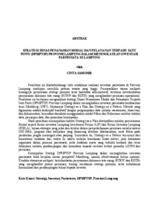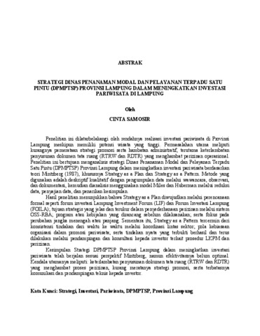 Cinta, Samosir (2025) Strategi Dinas Penanaman Modal dan Pelayanan Terpadu Satu Pintu (DPMPTSP) Provinsi Lampung Dalam Meningkatkan Investasi Pariwisata di Lampung. FAKULTAS ILMU SOSIAL DAN ILMU POLITIK, UNIVERSITAS LAMPUNG.