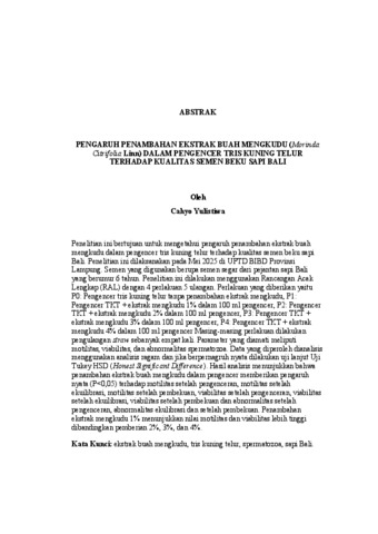 Cahyo , Yulistiwa (2025) PENGARUH PENAMBAHAN EKSTRAK BUAH MENGKUDU (Morinda Citrifolia Linn) DALAM PENGENCER TRIS KUNING TELUR TERHADAP KUALITAS SEMEN BEKU SAPI BALI. FAKULTAS PERTANIAN, UNIVERSITAS LAMPUNG.