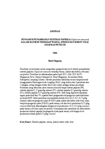 Penelitian ini bertujuan untuk mengetahui pengaruh dan level terbaik penambahan ekstrak paprika (Capsicum annuum) terhadap warna, indeks dan bobot yolk ayam ras petelur. Penelitian ini dilaksanakan pada April 2025--Mei 2025 di CV Margaraya Farm, Dusun Sukananti II, Desa Margaraya, Kecamatan Natar, Kabupaten Lampung Selatan. Metode penelitian dilakukan secara eksperimental menggunakan Rancangan Acak Lengkap (RAL) yang terdiri atas 4 perlakuan dan 5 ulangan, setiap ulangan terdiri dari 6 ekor ayam sebagai satuan percobaan. Perlakuan yang diberikan yaitu ransum komersil tanpa ekstrak paprika (P0), ekstrak paprika 0, 25 gram/kg ransum (P1), ekstrak paprika 0,5 gram/kg ransum (P2), ekstrak paprika 0,75 gram/kg ransum (P3). Data yang diperoleh dianalisis ragam pada taraf dan 5%, apabila hasil pengamatan berpengaruh nyata dilakukan uji lanjut BNT. Hasil penelitian menunjukkan bahwa level (0,25; 0,5; 0,75 g/kg ransum) tidak berpengaruh nyata (P>0,05) pada indeks dan bobot yolk telur, akan tetapi berpengaruh nyata (P<0,05) pada warna yolk dan level pemberian 0,75 g/kg ransum lebih baik dibandingkan dengan level pemberian ( 0,25; 0,5 g/kg ransum) pada warna yolk telur ayam ras petelur. Kesimpulan dari penelitian ini ialah bahwa pemberian ekstrak paprika berpengaruh nyata pada warna yolk dengan level pemberian terbaik pada 0,75 g/kg ransum. Kata Kunci : Ekstrak paprika, warna, indeks, bobot yolk, telur This study aimed to determine the effect and the optimal level of paprika extract (Capsicum annuum) supplementation on yolk color, yolk index, and yolk weight of commercial laying hens. The research was conducted from April 2025 to May 2025 at CV Margaraya Farm, Dusun Sukananti II, Margaraya Village, Natar District, South Lampung Regency. The experimental method used was a Completely Randomized Design (CRD) consisting of 4 treatments with 5 replications, and each experimental unit contained 6 hens. The treatments applied were: commercial ransum without paprika extract (P0), paprika extract at 0.25 g/kg ransum (P1), 0.5 g/kg ransum (P2), and 0.75 g/kg ransum (P3). The data obtained were analyzed using Analysis of Variance (ANOVA) at a 5% significance level, and if a significant effect was observed, Duncan’s Multiple Range Test (DMRT) was performed. The results showed that the supplementation levels (0.25, 0.5, and 0.75 g/kg ransum) had no significant effect (P>0.05) on yolk index and yolk weight, but had a significant effect (P<0.05) on yolk color. The 0.75 g/kg ransum level was more effective compared to 0.25 and 0.5 g/kg ransum in improving yolk color. In conclusion, the supplementation of paprika extract significantly affected yolk color, with the best effect obtained at the level of 0.75 g/kg ransum. Keywords: Paprika extract, color, index, yolk weight, egg