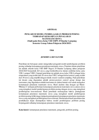 Jendhiya, Reviantri (2025) PENGARUH MODEL PEMBELAJARAN PROBLEM POSING TERHADAP KEMAMPUAN PENALARAN MATEMATIS SISWA (Studi pada Siswa Kelas VIII SMPN 29 Bandar Lampung Semester Genap Tahun Pelajaran 2024/2025). FAKULTAS KEGURUAN DAN ILMU PENDIDIKAN, UNIVERSITAS LAMPUNG.